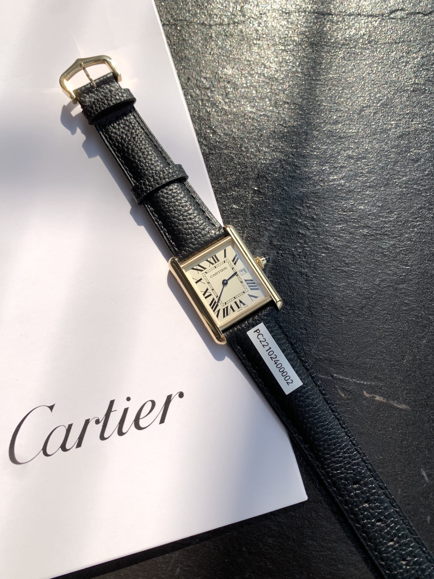 New Cartier Tank watch replica. 18k gold plated, Swiss quartz, 33.7mm size. Alligator strap, waterproof. With certificate and packaging.
