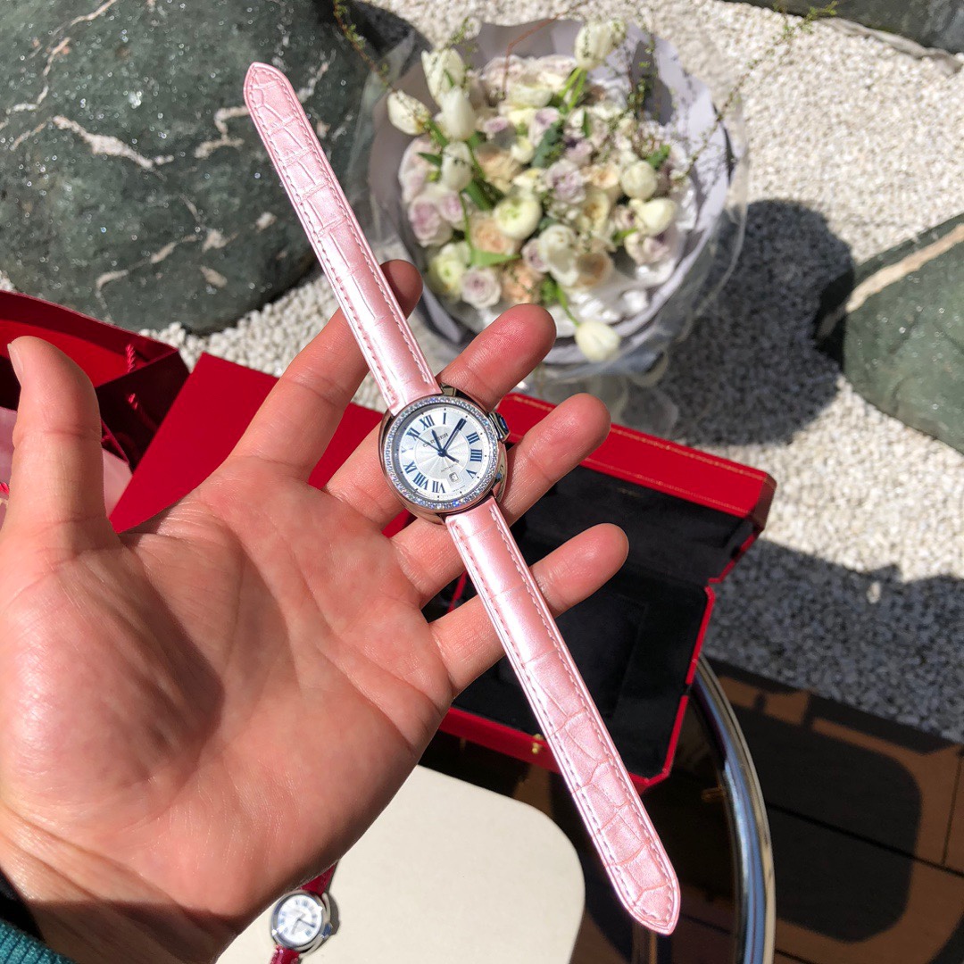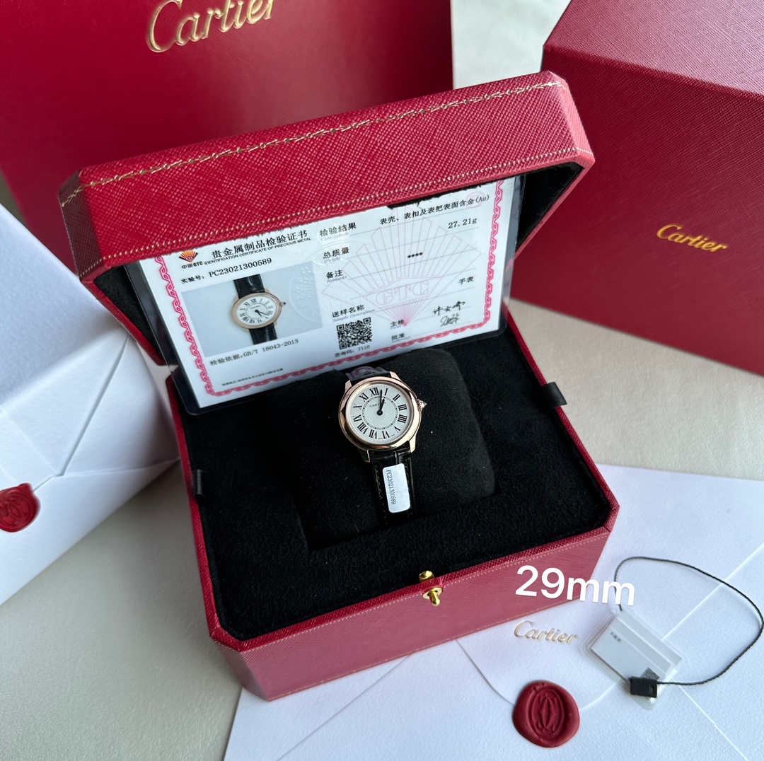 Cartier Ronde Louis quartz rose gold alligator strap watch, 29mm diameter, 7.54mm thickness, water resistant to 30m. Top quality with full packaging. Four colors available.