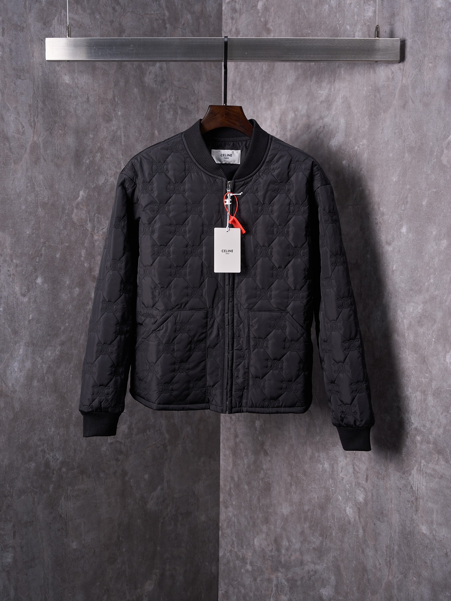 Celine Triomphe embroidered quilted nylon zip-up jacket. Available in sizes 48-54. Features iconic logo, baseball collar, and premium construction.