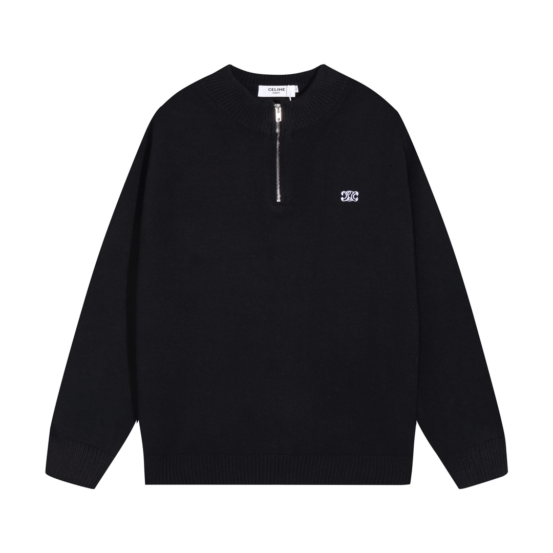 Celine embroidered logo zip-up wool sweater. Colors: black, gray. Sizes: S M L XL XXL.
