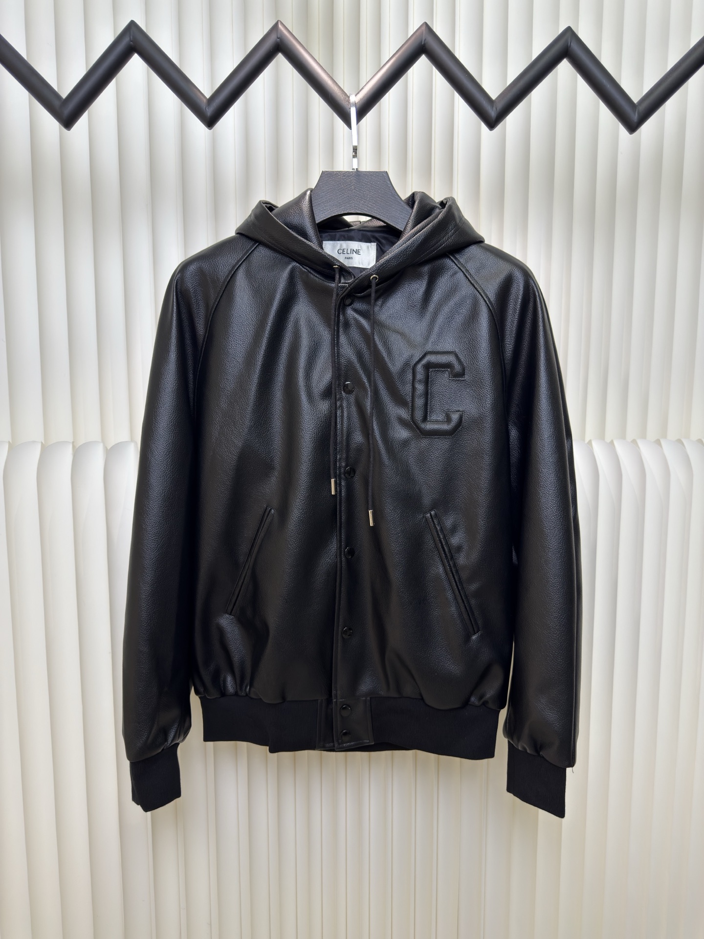 Celine Leather Hooded Jacket Custom premium leather and Tencel blend. Features iconic "C" logo, elegant black tone, and versatile hooded design. Laser-cut 3D contours, precise snap placement, and template-guided pockets. Slim fit. Sizes 46-52.