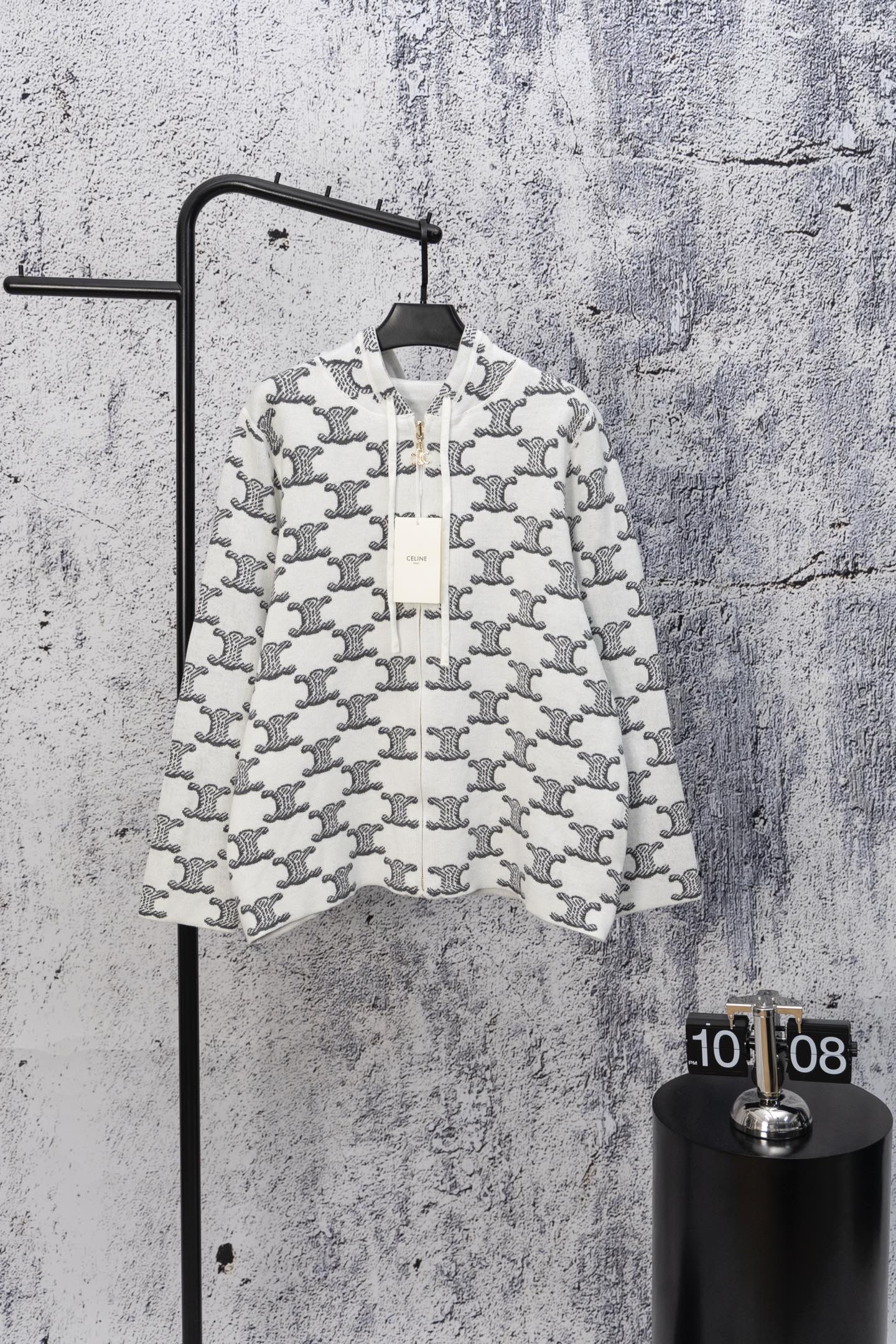 CELINE 2025 Fall/Winter reversible cashmere hooded cardigan. Soft, comfortable, double-sided design with adjustable hood. Colors: Brown, White. Sizes: S, M, L.