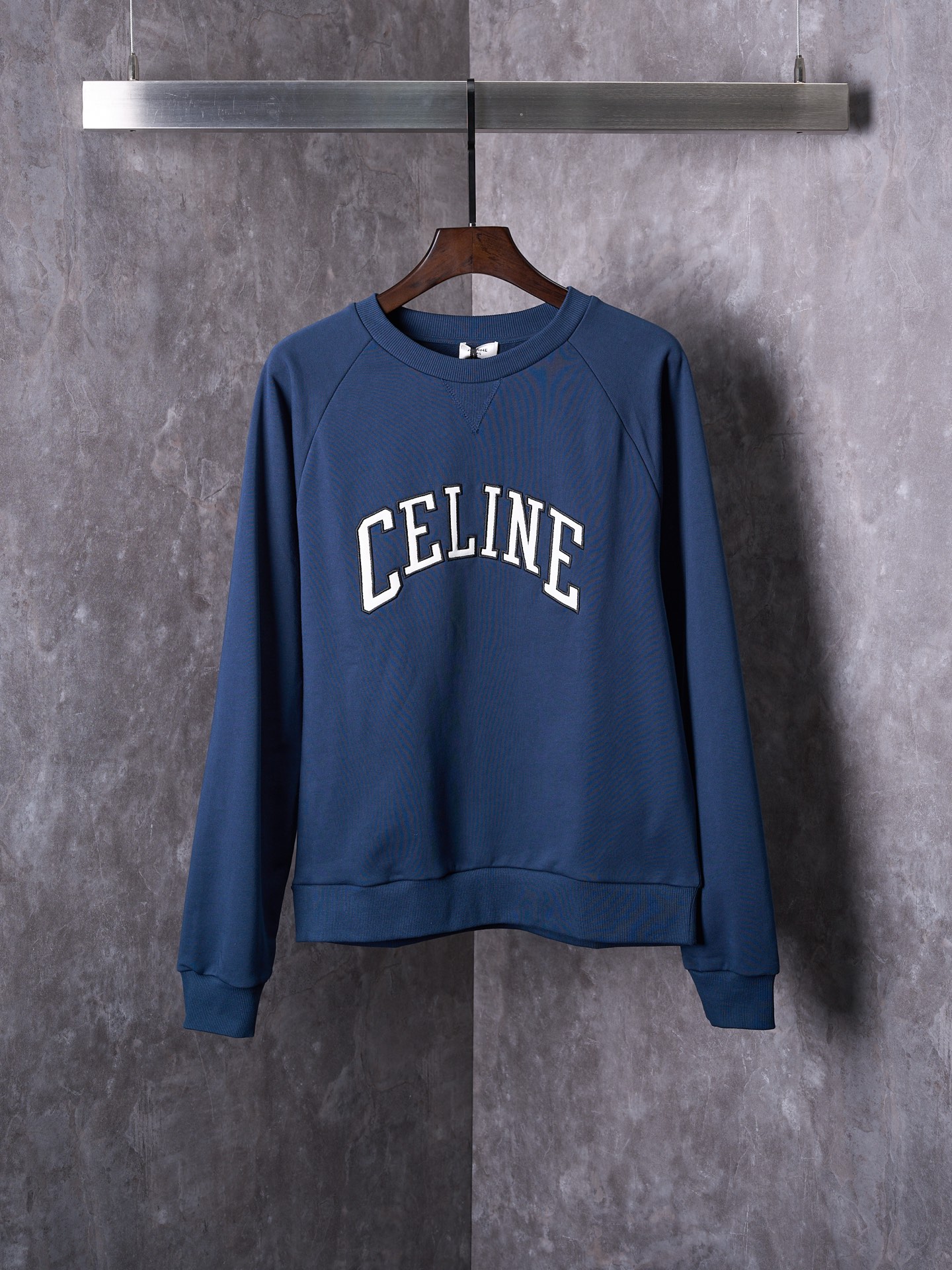 Celine letter embroidery sweatshirt. Available in XS, S, M, L. Made with 26S/10S double yarn for softness and warmth. Features patch embroidery and classic fit.