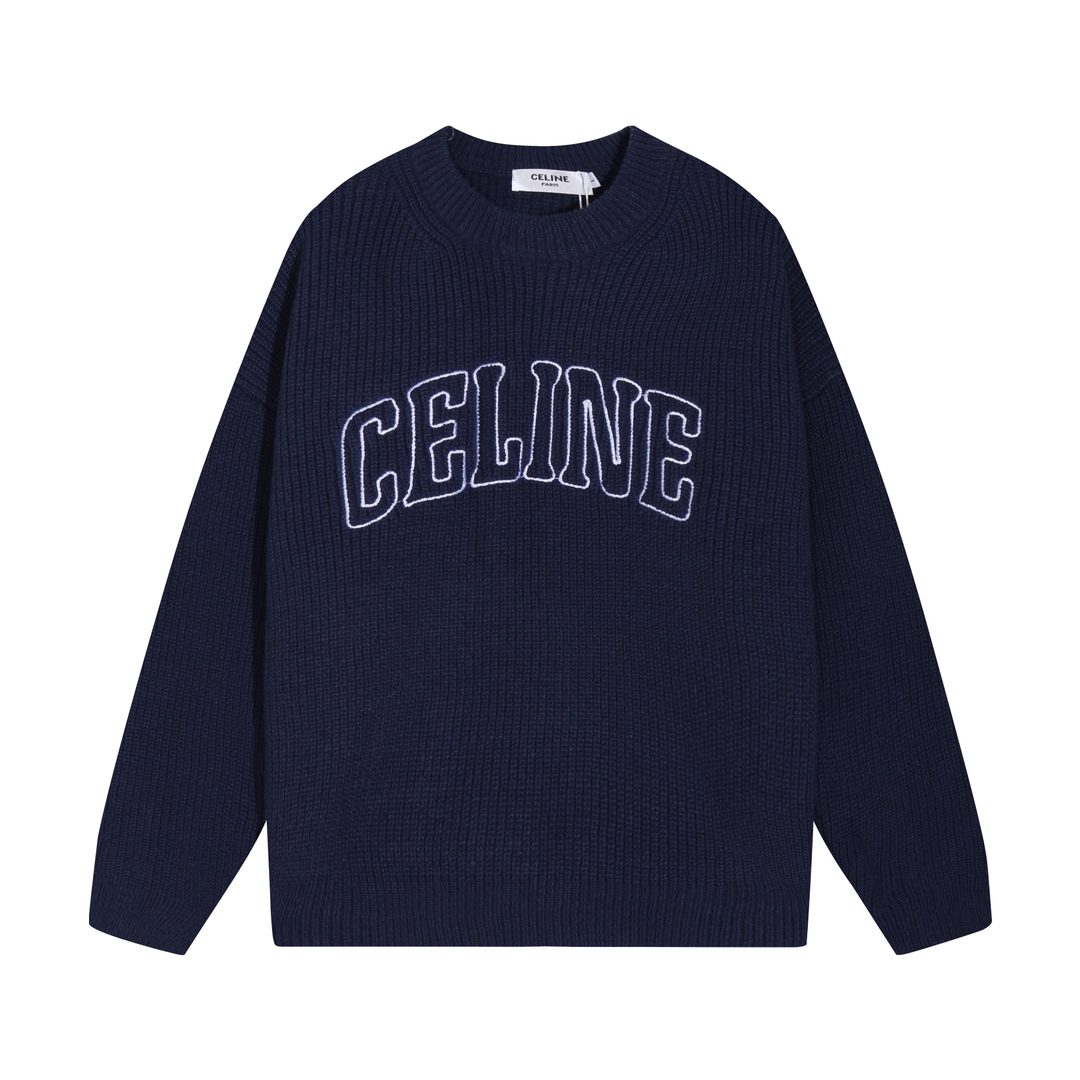 Celine embroidered letter wool sweater in blue. Sizes S M L XL XXL.