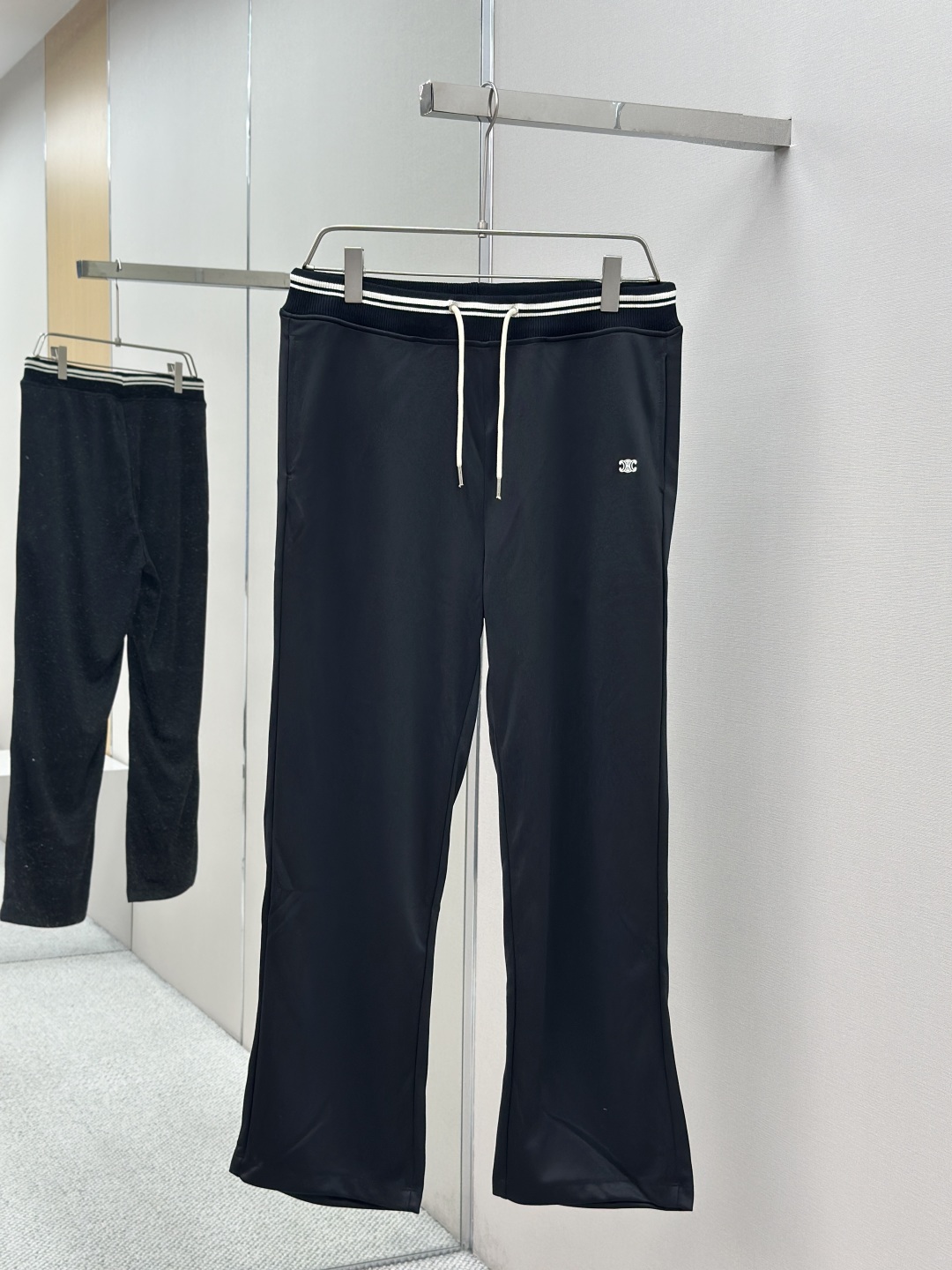 Celine Arch of Triumph Embroidered Pants. Custom double-sided satin, smooth and skin-friendly. Iconic Celine embroidery, simple yet stylish. Perfect urban fashion with high-end气质. Crafted with imported embroidery and pre-washed fabric for durability. Custom Celine logo eyelets, end clips, tape, and label. Slim fit. Sizes S, M, L, XL. Exclusive supply.