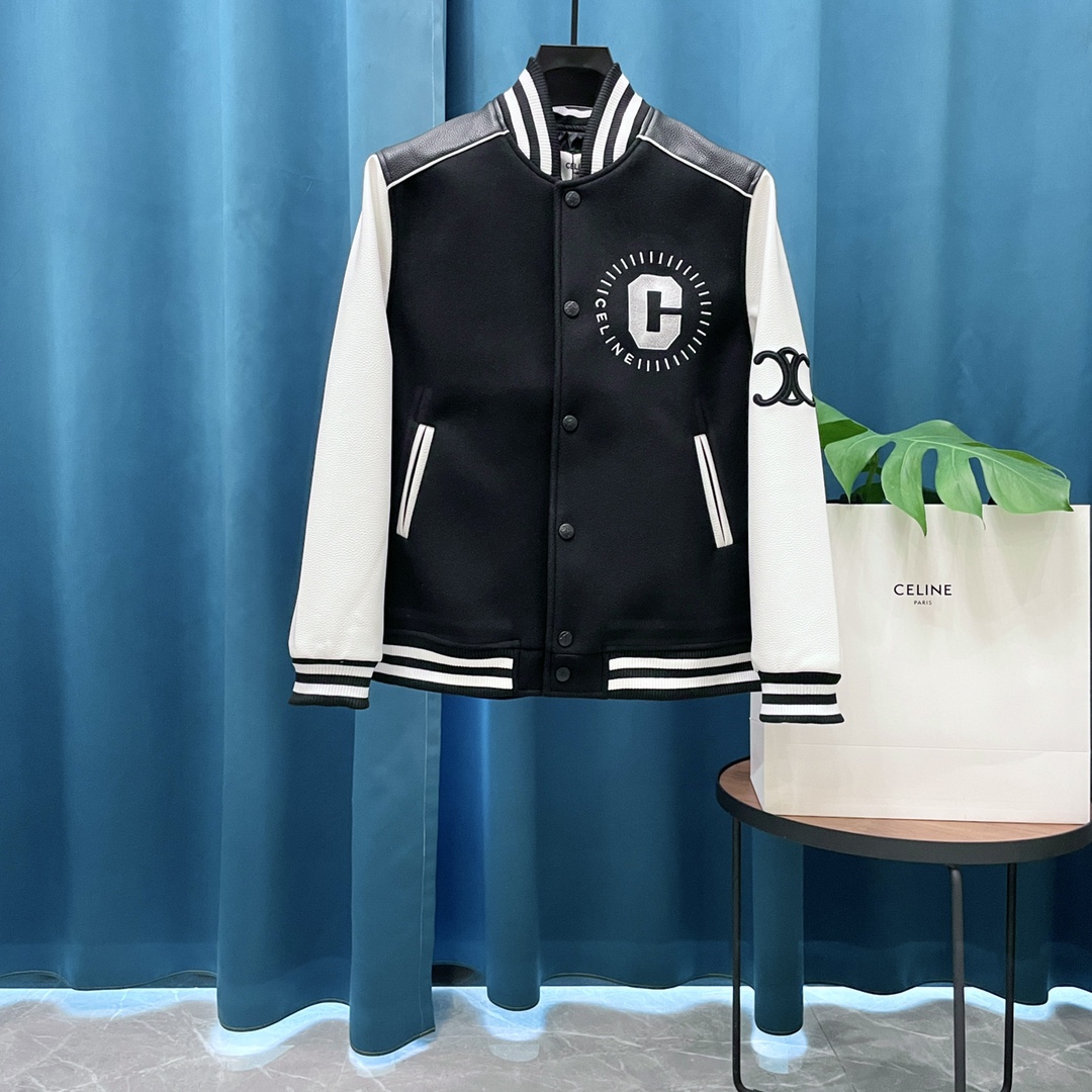 Celine baseball jacket, custom runway style. High-quality materials: imported wool and lambskin. Detailed craftsmanship, unisex luxury item. Sizes: S M L XL.