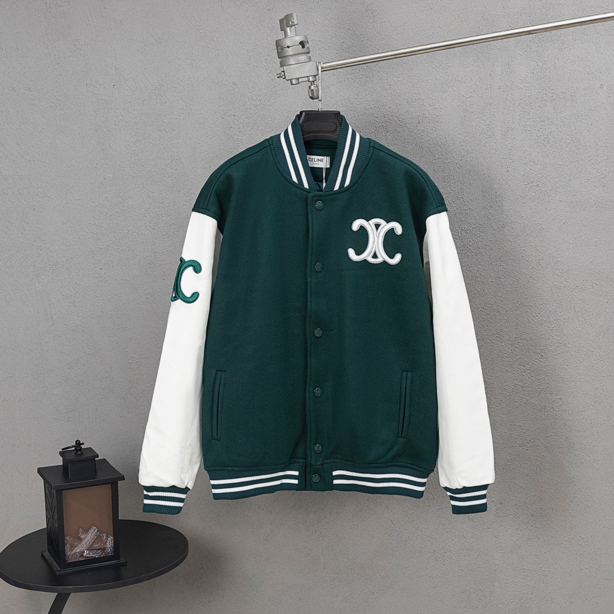 Celine 2024ss collegiate-style color-blocked baseball jacket. Sizes: M, L, XL, XXL. Hand wash or dry clean. High-quality details, custom materials, embroidered logo.