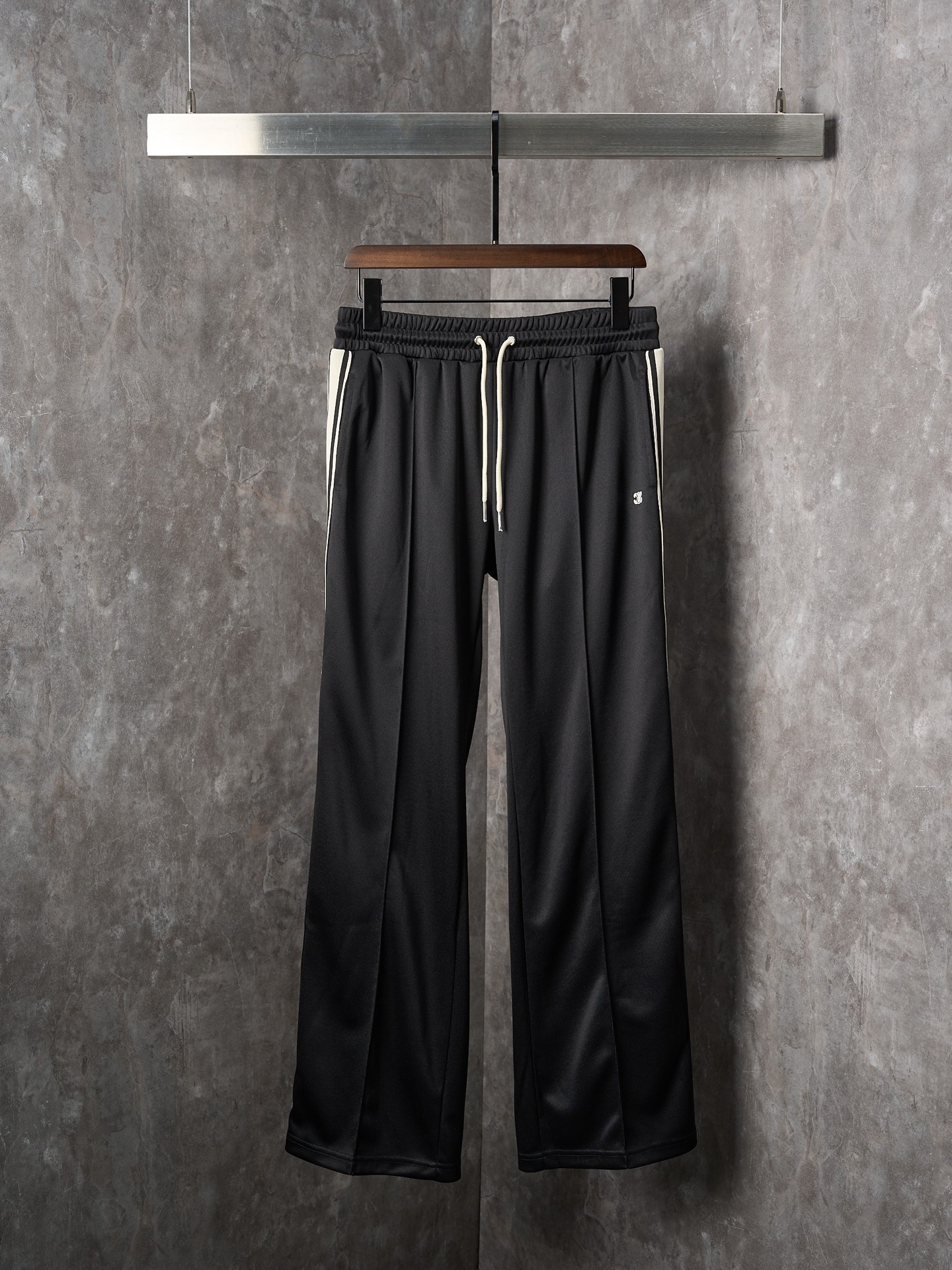 Celine Triomphe embroidered stripe pants. Available in S, M, L, XL. Smooth recycled silk blend, straight-leg cut, iconic embroidery, hand-stitched trim. Pre-washed to prevent shrinkage or fading.