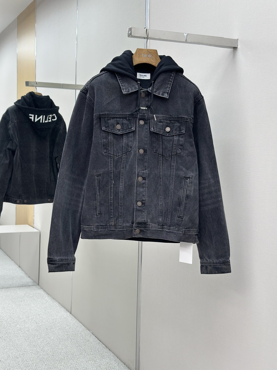 Celine classic hooded denim jacket. Made from premium cotton twill denim fleece, comfortable and skin-friendly. Vintage wash color, minimalist design, clean lines. Features custom logo eyelets, rivets, buttons, and label. Regular fit.