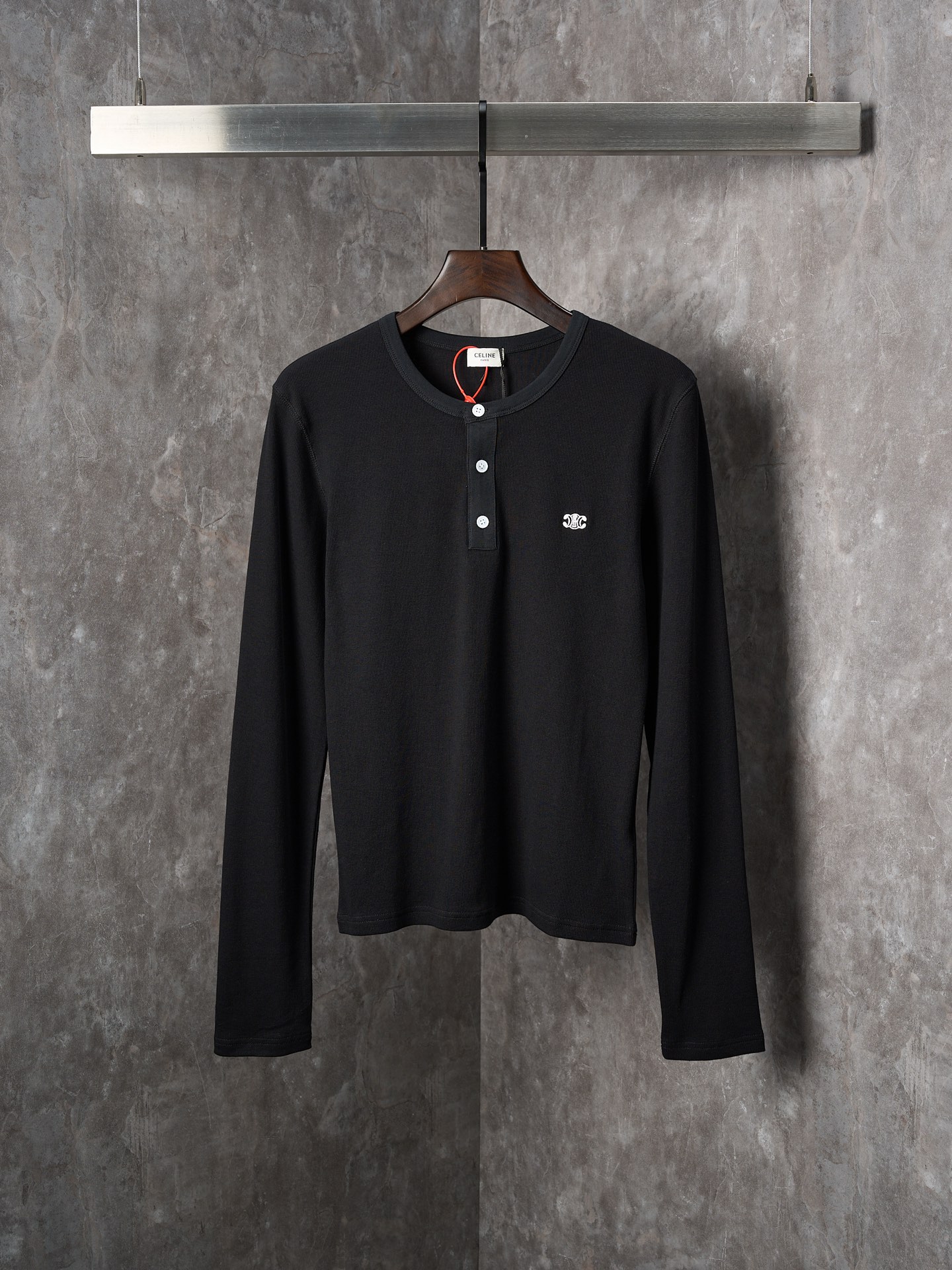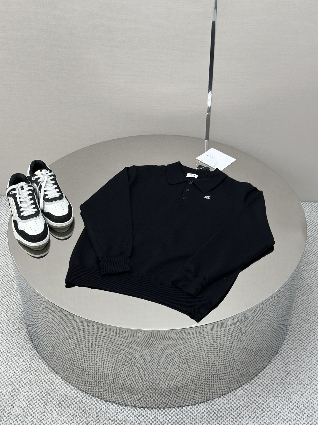 Celine Triomphe embroidered henley knit sweater. Soft cotton blend, classic fit. Available in S, M, L, XL.