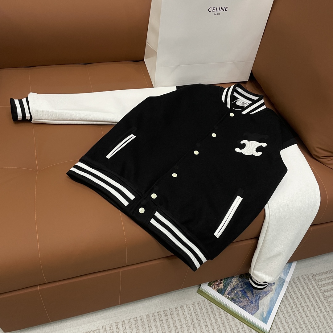 Celine show-style baseball jacket. Custom high-end version with imported lambskin and wool jacquard. Exquisite craftsmanship, heavy-duty embroidery. Unisex luxury essential.