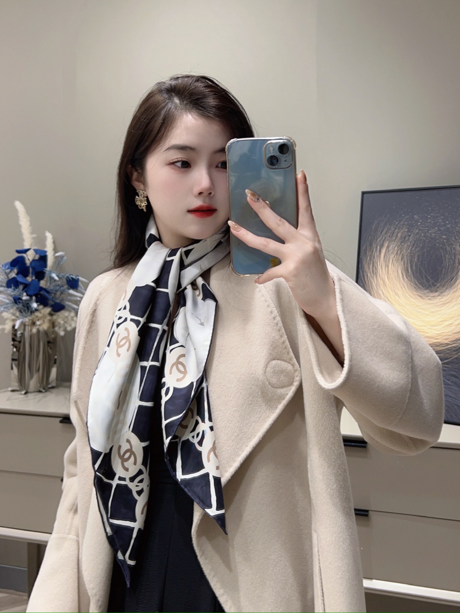 Chanel new floral velvet scarf. Elegant, soft silk-cashmere design with pearl series. Versatile, high-quality 140x140cm accessory for all seasons.