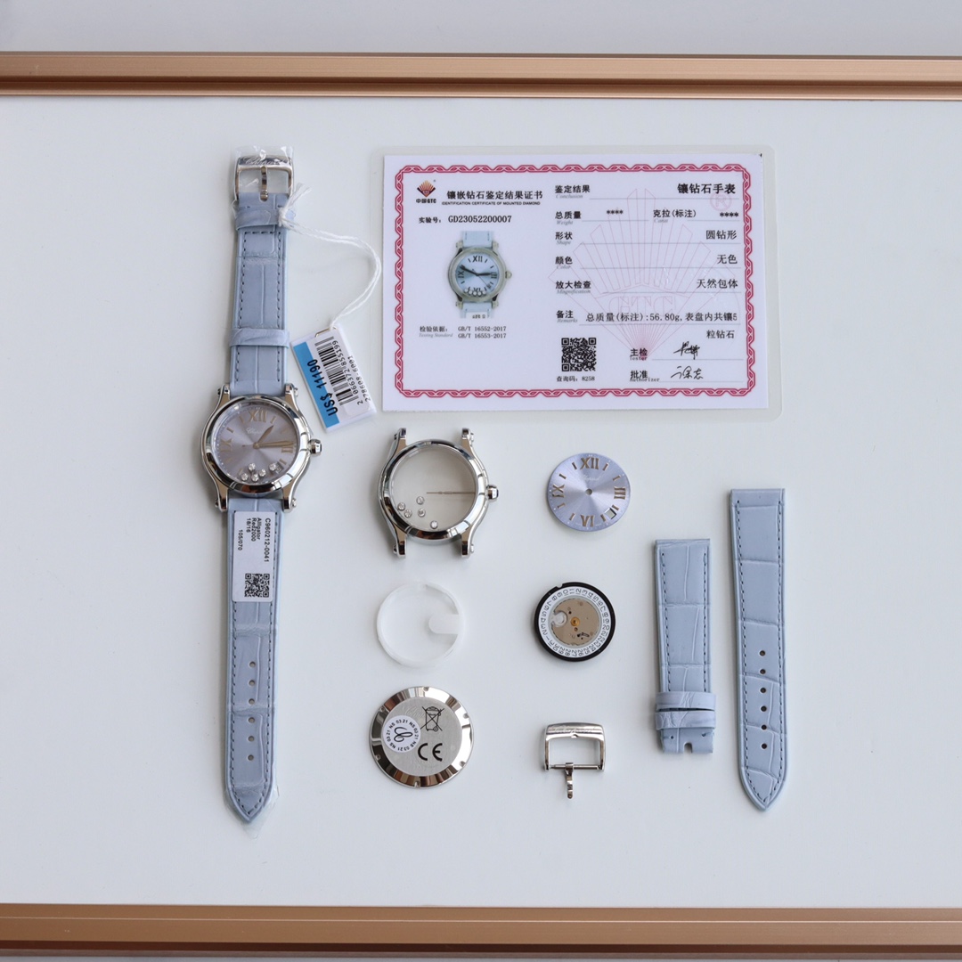 Chopard Happy Diamonds watch with genuine diamonds, three colors available, 36mm steel case, sapphire crystal, alligator strap, full set included.