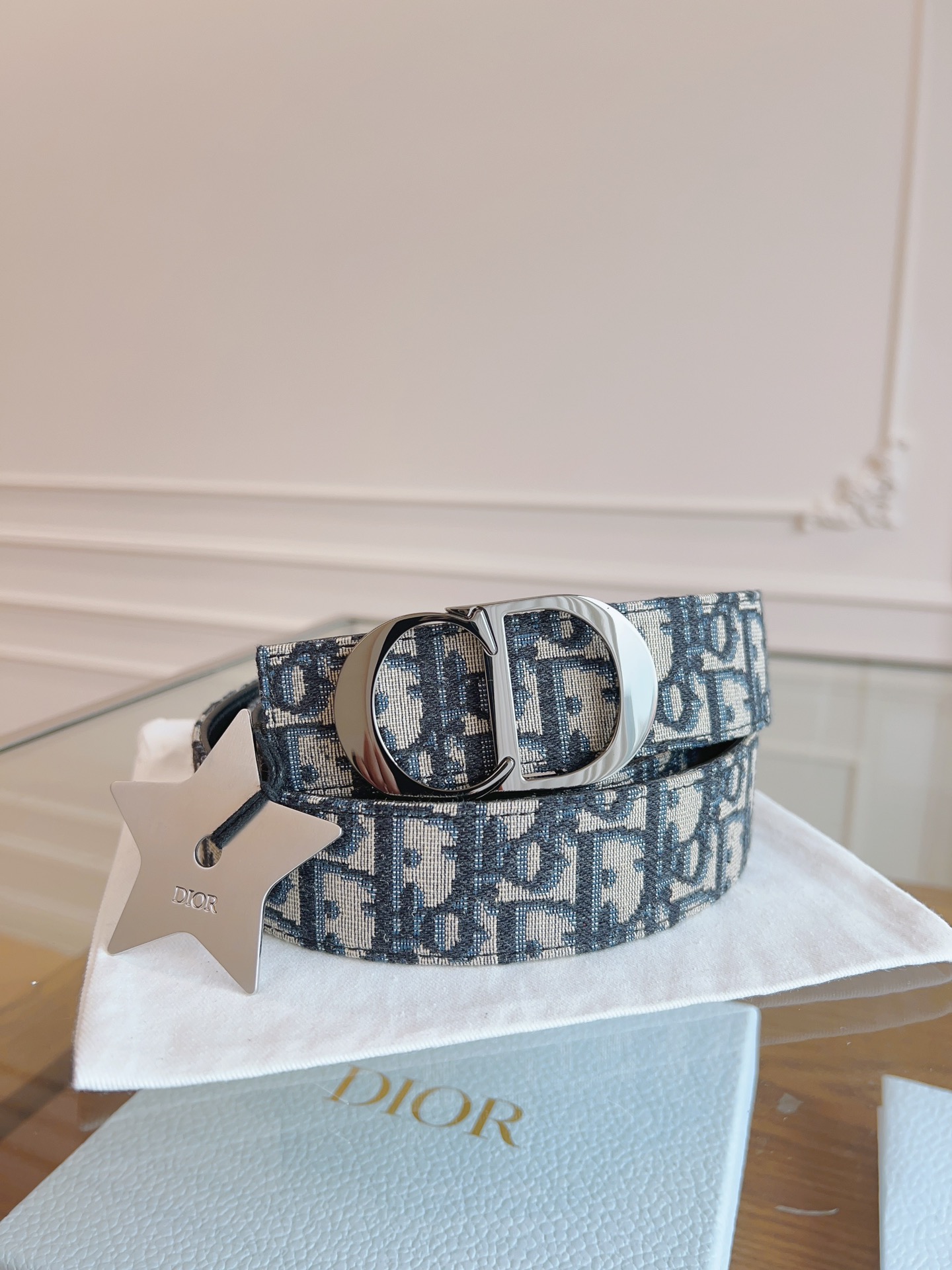 Width 3.5cm. This double-sided belt is made of 35mm blue denim and smooth calfskin with Oblique print and Peace Sign pattern. Inspired by the namesake handbag, the 35mm Montaigne Avenue belt is crafted from black smooth calfskin, featuring a new glossy gold metal CD buckle. Adjustable back slide for a classic, elegant touch to suits, dresses, or jeans.