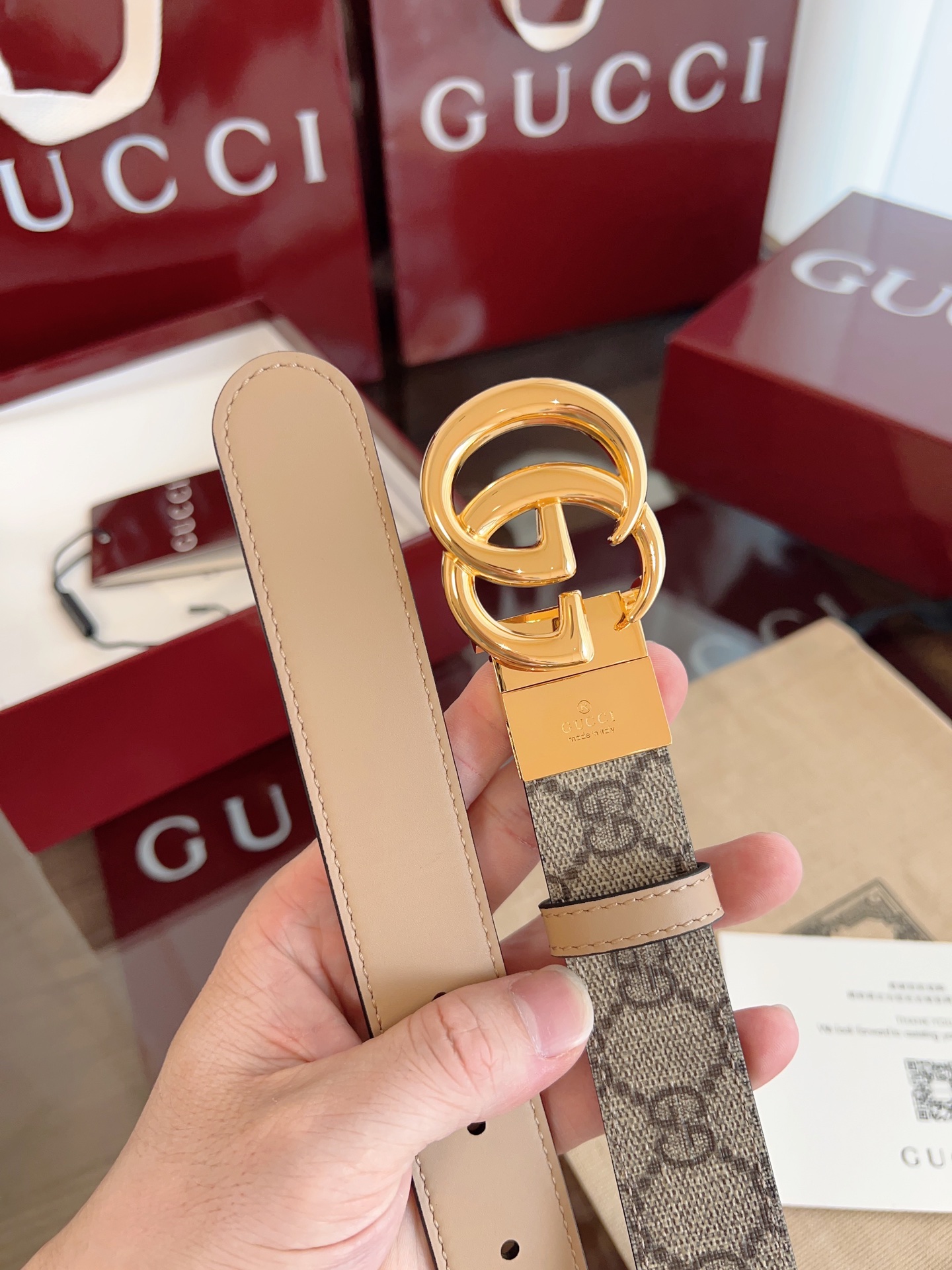 Gucci 2025 new light pink belt, 3cm width, rotating gold double G buckle, waterproof VC material.