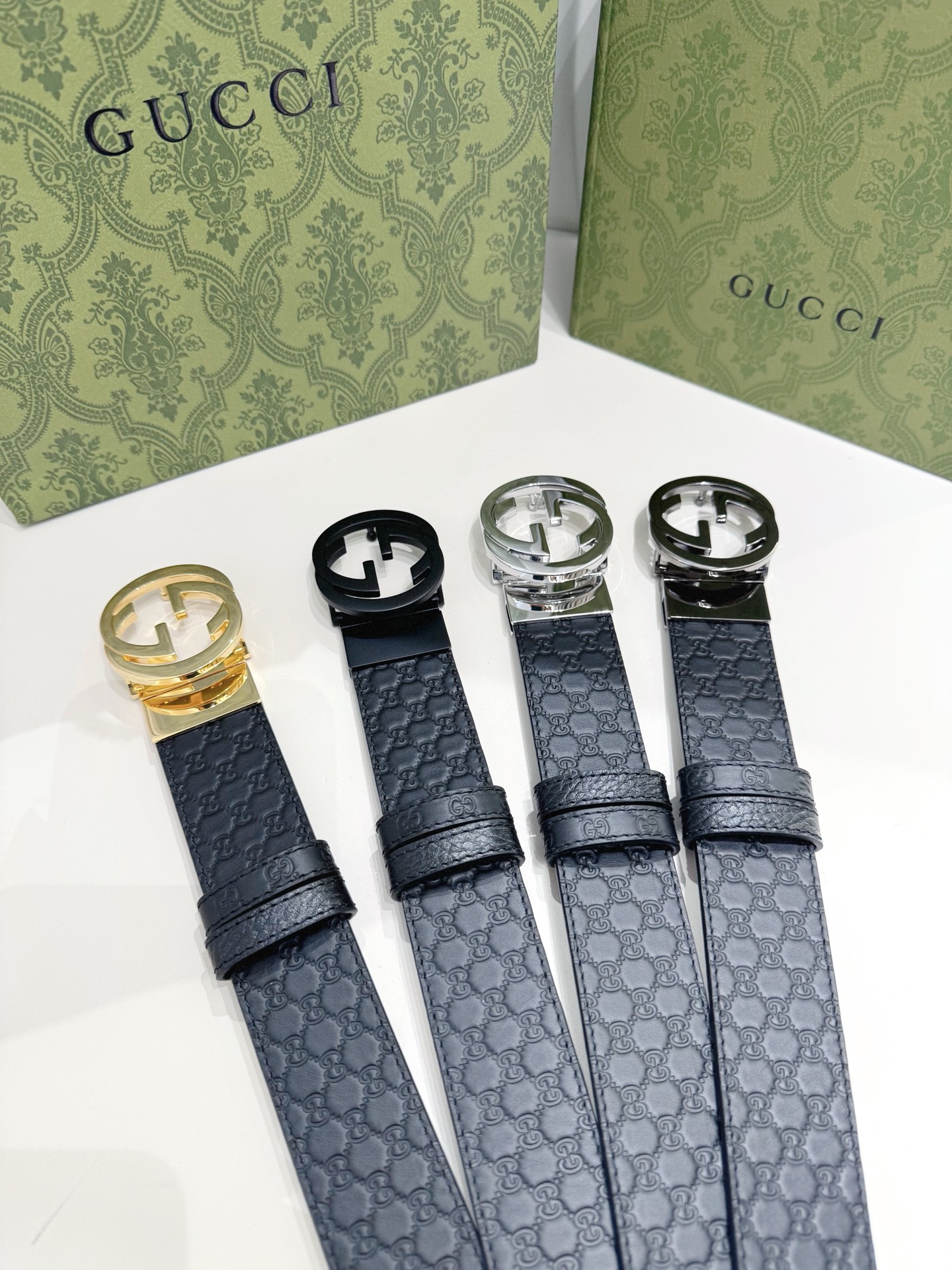 Exquisite Gucci double G men's new belt, 3.5cm wide, canvas beige monogram with black imported pigskin grain, vacuum electroplated steel buckle, reversible.