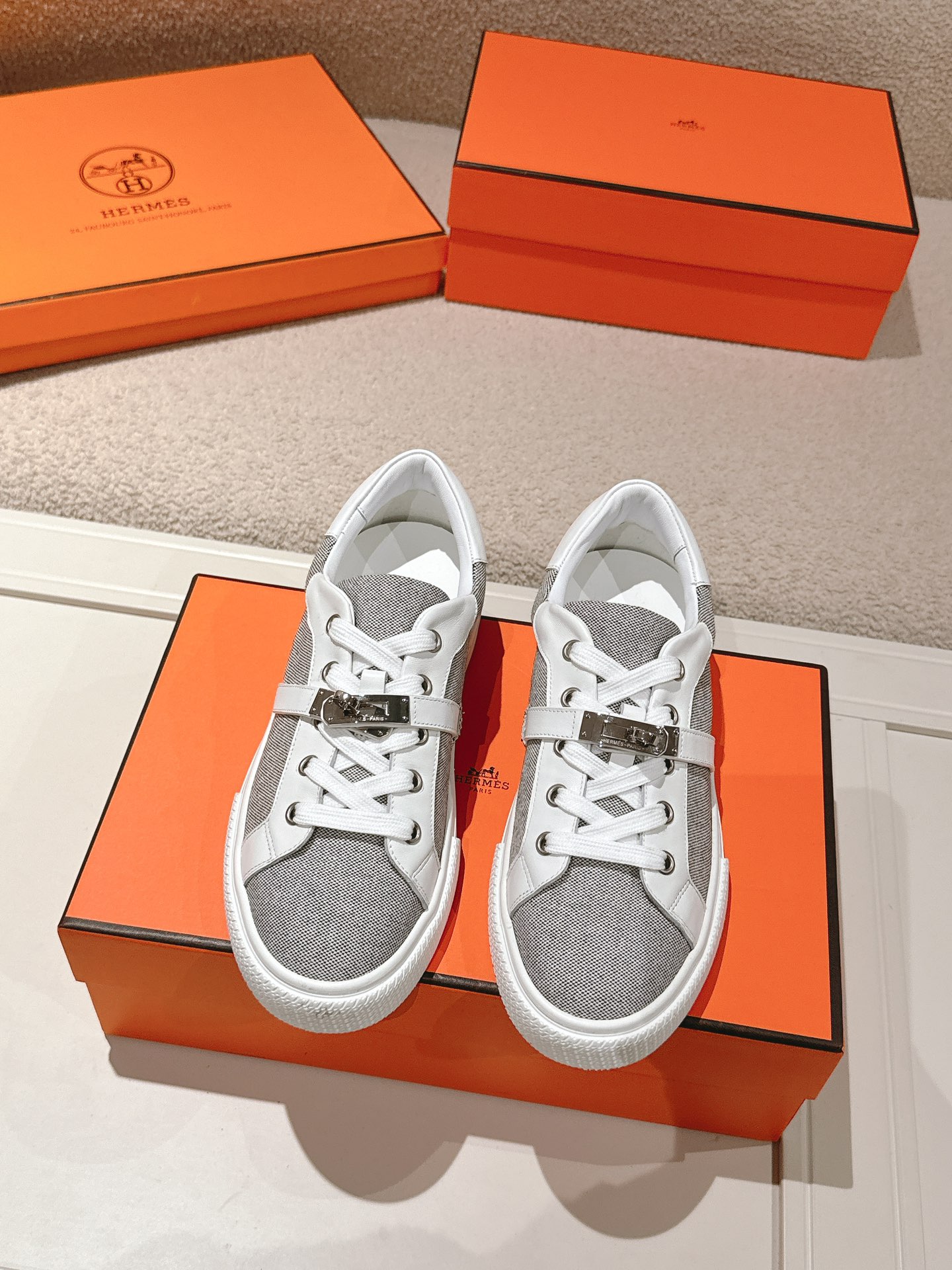 Hermes Kelly buckle sneakers in premium calfskin and canvas, with sheepskin lining and original TPU sole. Unisex sizes 35-45. Versatile high-end design.