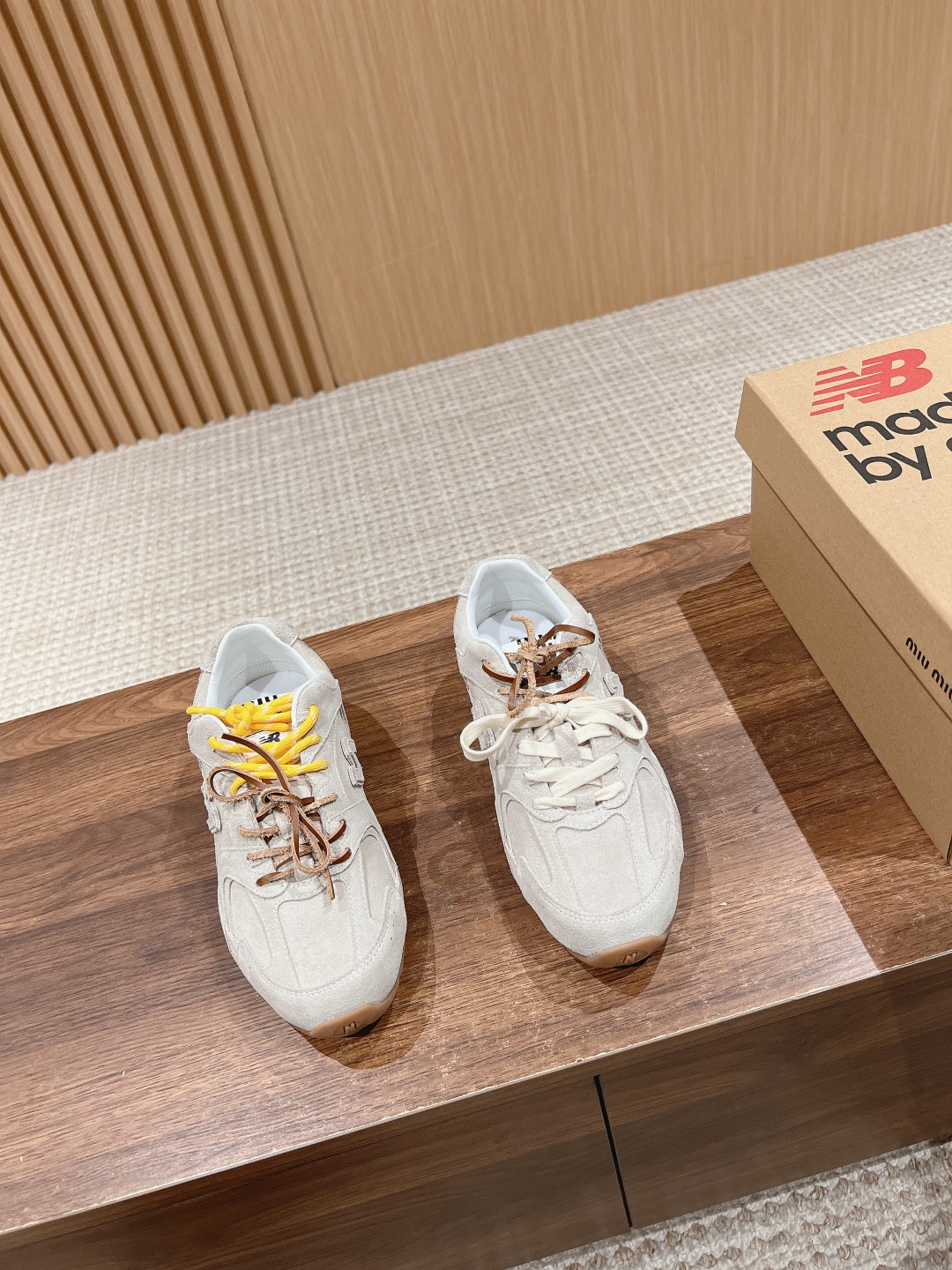 MiuMiu x New Balance 530 collaboration sneakers. Leather and suede upper with dual laces. Includes three lace sets. Sizes 35-45.