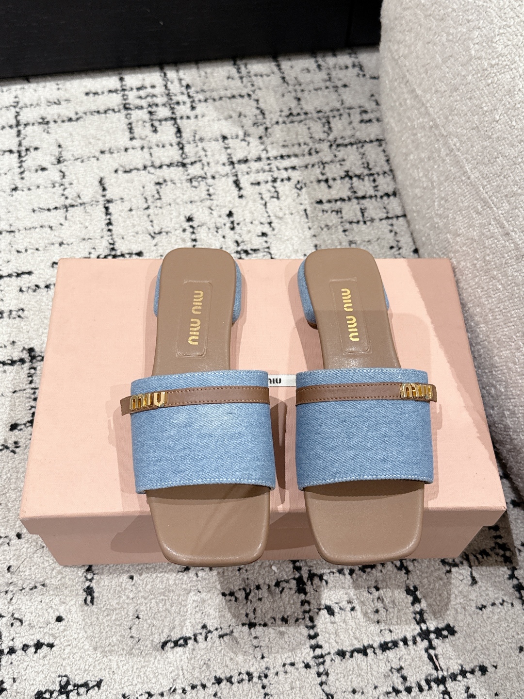 Miu Miu 25ss summer flat denim leather slippers. Handmade with cloud heel design. Upper: denim/leather, lining: leather, sole: Italian handcrafted leather. Sizes 35-40.