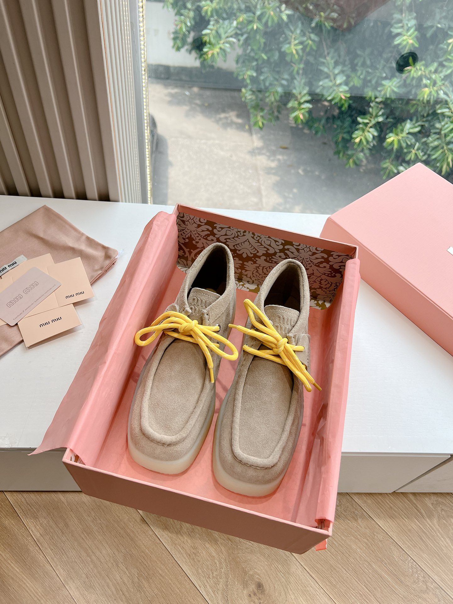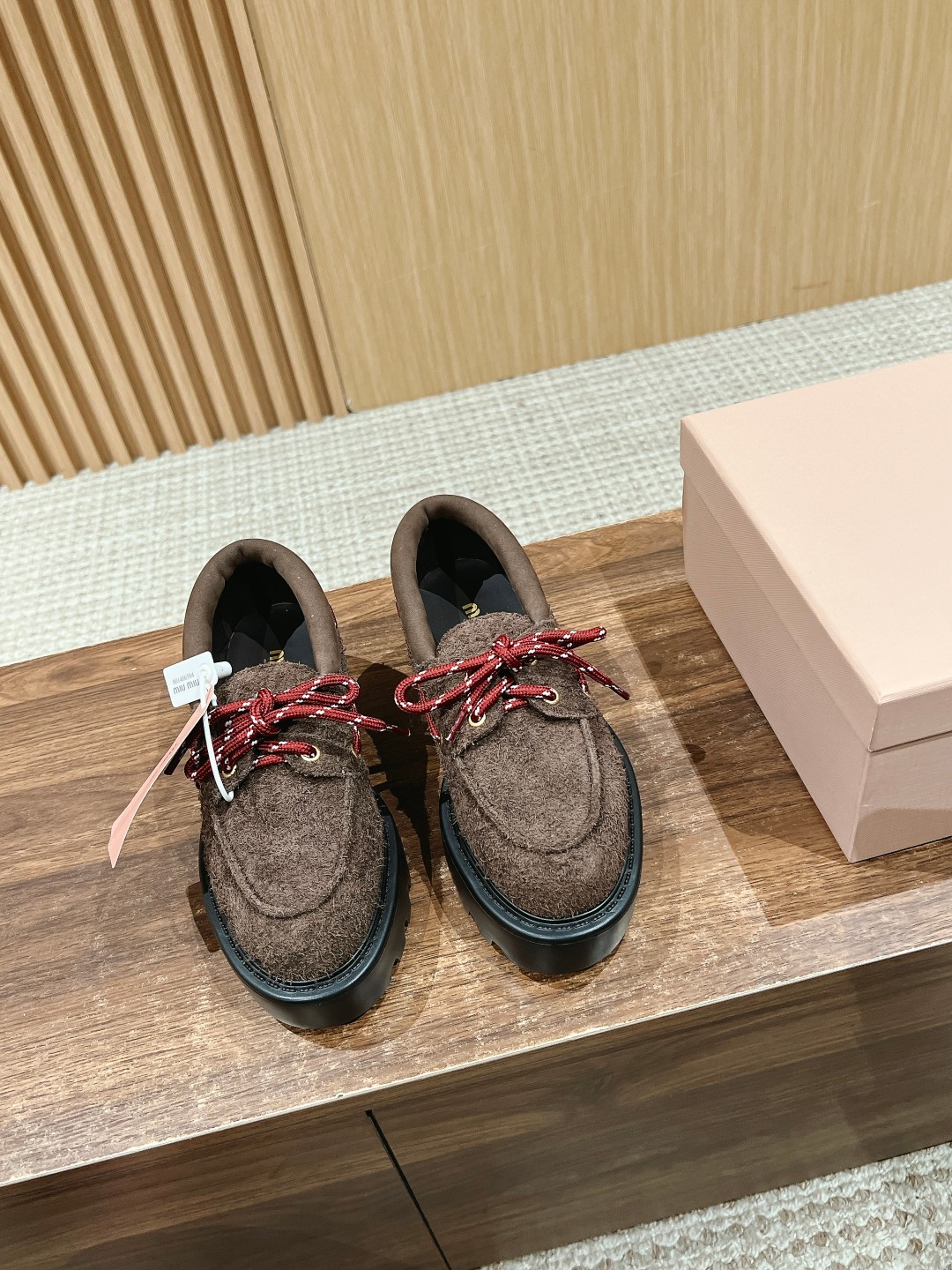Dongguan version MiuMiu lace-up platform loafers, preppy style. High-end craft, versatile wear. Imported suede leather, comfortable sole. Sizes 35-40.