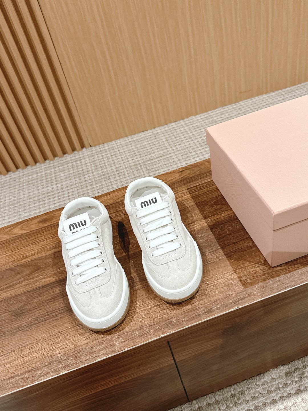 MiuMiu 2024 SS new suede platform sneakers. Handcrafted white calfskin with vintage effect. Sizes 35-41.