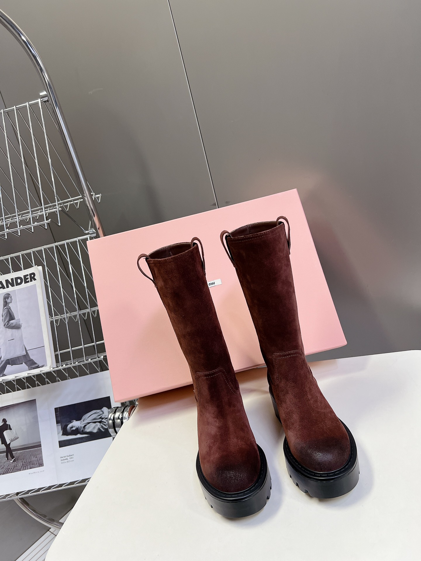 Miu Miu autumn-winter new thick sole boots. Calf suede upper and lining, rubber sole. Sizes 35-41. Highly recommended, comfortable and stylish with logo tag.