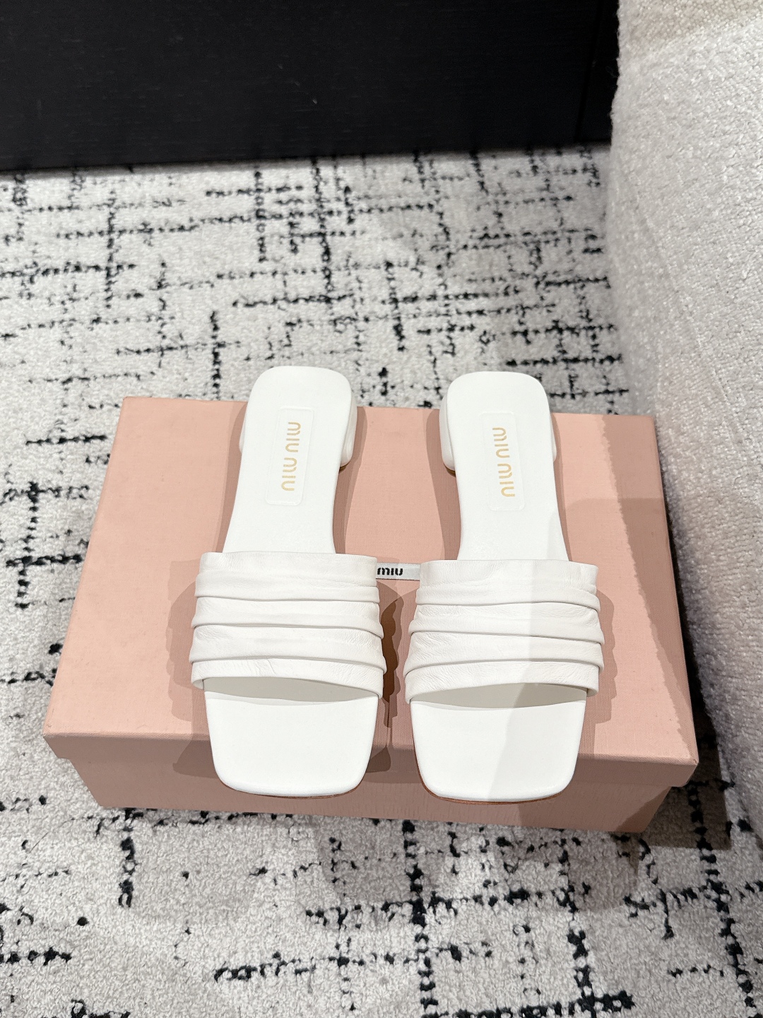 Miu Miu 25ss summer flat denim leather slippers. Handmade with cloud heel design. Upper: denim/lamb leather, lining: lamb leather, sole: Italian handcrafted leather. Sizes 35-40.