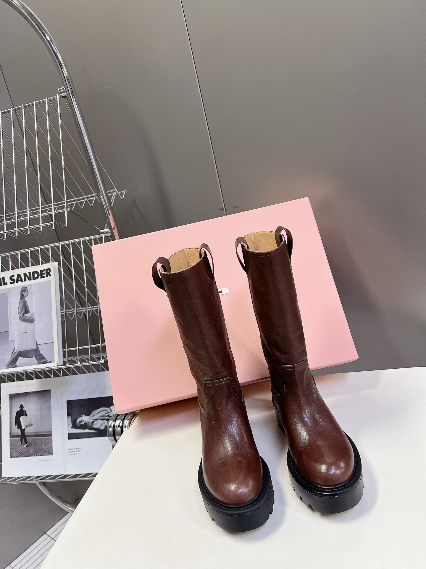 Premium Miumiu knee-high boots, autumn-winter show style. Soft imported leather, 5.5cm sole. Sizes 35-40. Comfortable, lengthening fit.