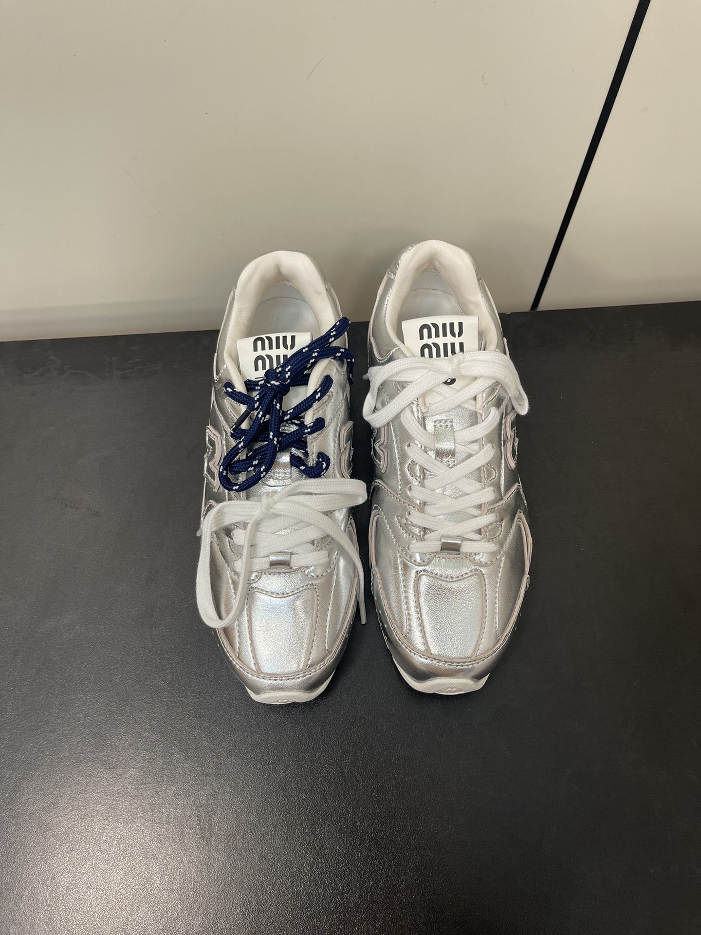 MiuMiu new vintage-style sneakers, minimalist design. Top-grade leather, silk-lined interior. Retro worn look, comfortable unisex fit. Sizes 35-45.