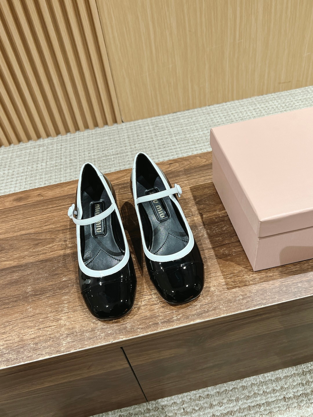 MiuMiu 2025 early spring new two-tone Mary Jane shoes. Very versatile and comfortable heel height. Made with specific cow patent leather, lambskin lining, and genuine leather sole. Sizes 35-40.