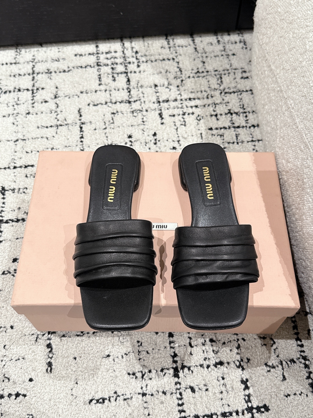 Miu Miu 25ss summer flat denim leather slippers. Handcrafted with cloud heel design. Upper: denim/leather, lining: leather, sole: Italian handcrafted leather. Sizes 35-40.