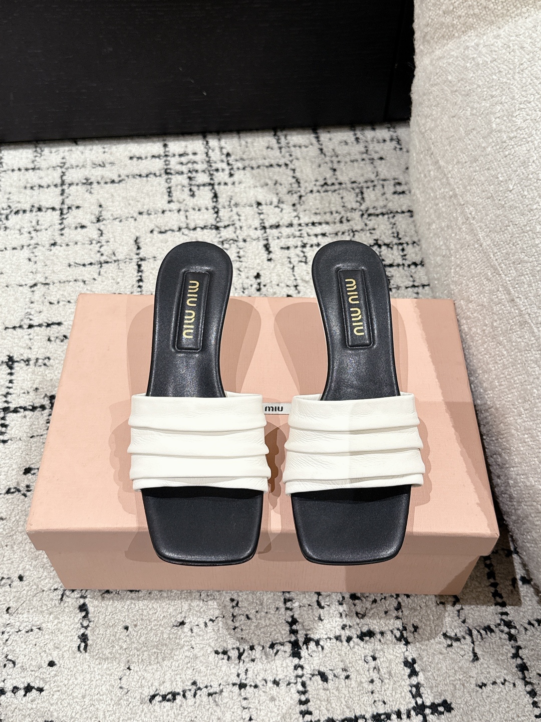 Miu Miu 25ss summer flat denim lambskin slippers. Handcrafted with cloud-shaped heel. Upper: denim/lambskin, lining: lambskin, sole: Italian leather. Sizes 35-40.