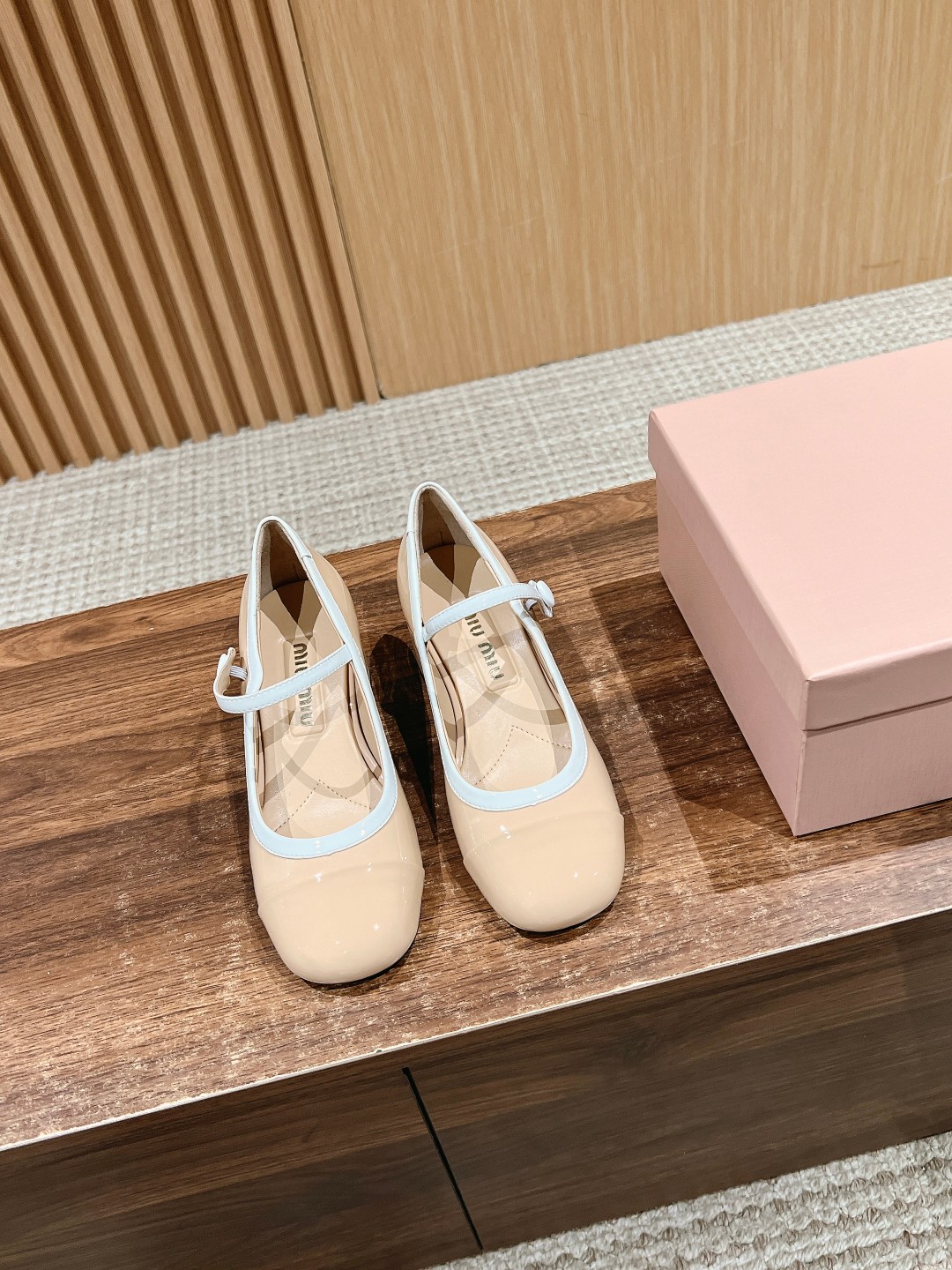 MiuMiu 2025 early spring new color-block Mary Jane shoes. Versatile, comfortable heel height. Specific cow patent leather, lambskin lining, leather sole. Sizes 35-40.