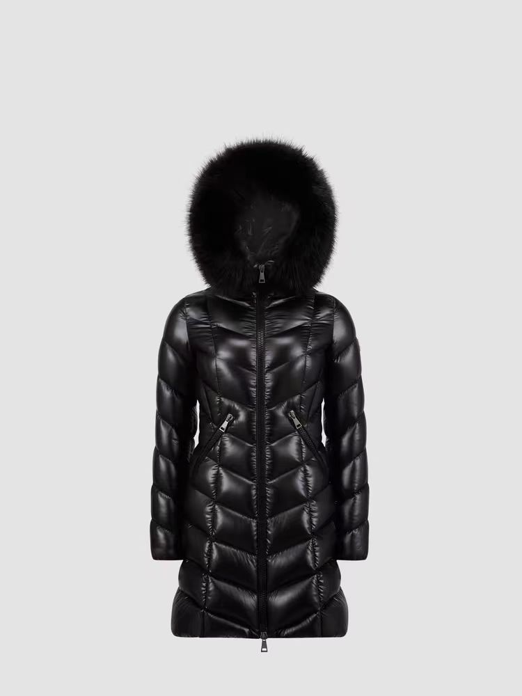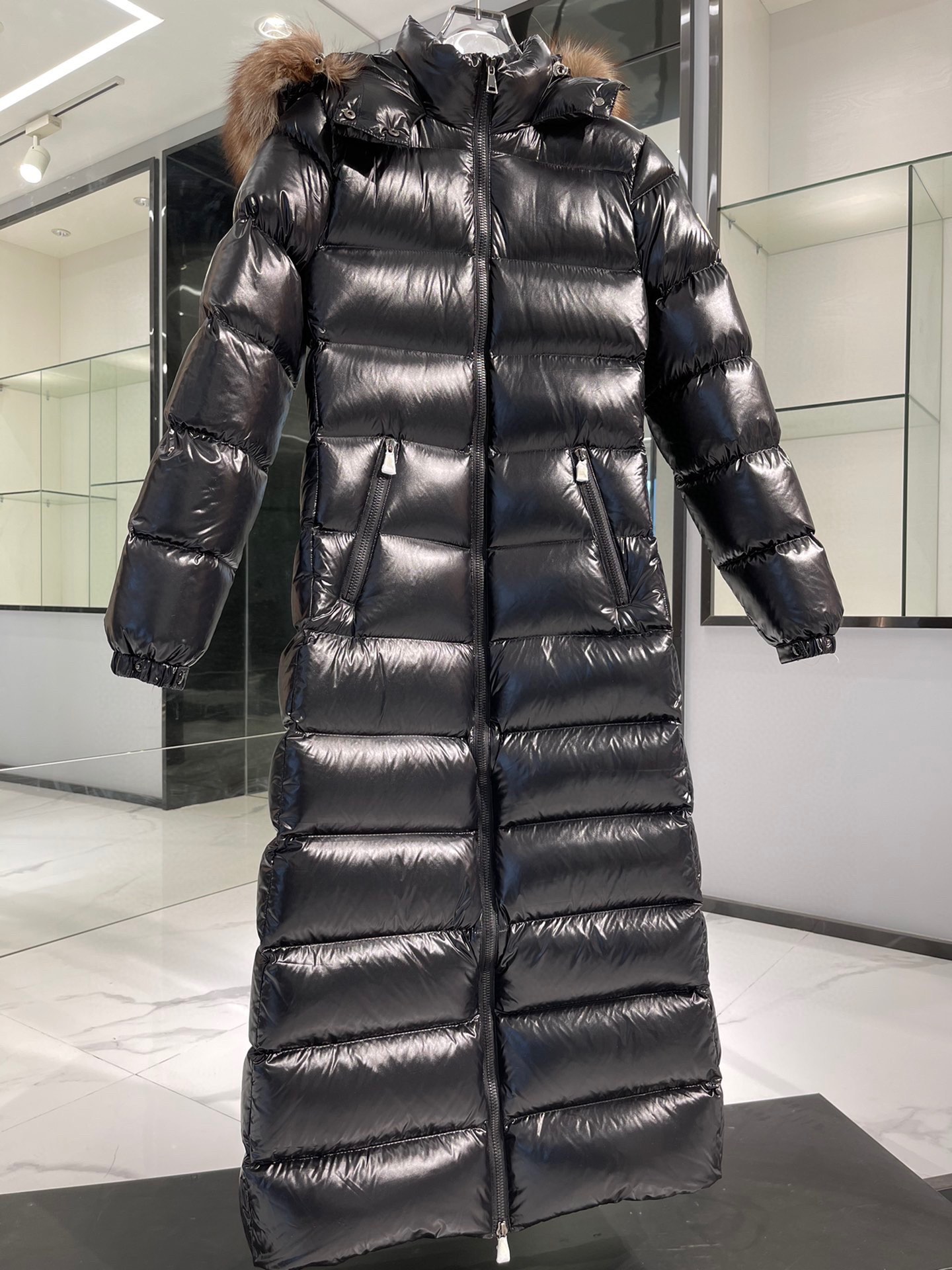 High-quality Guangzhou Moncler Fulmarus long down jacket with fox fur hood. Colors: Black. Sizes: 1-4.