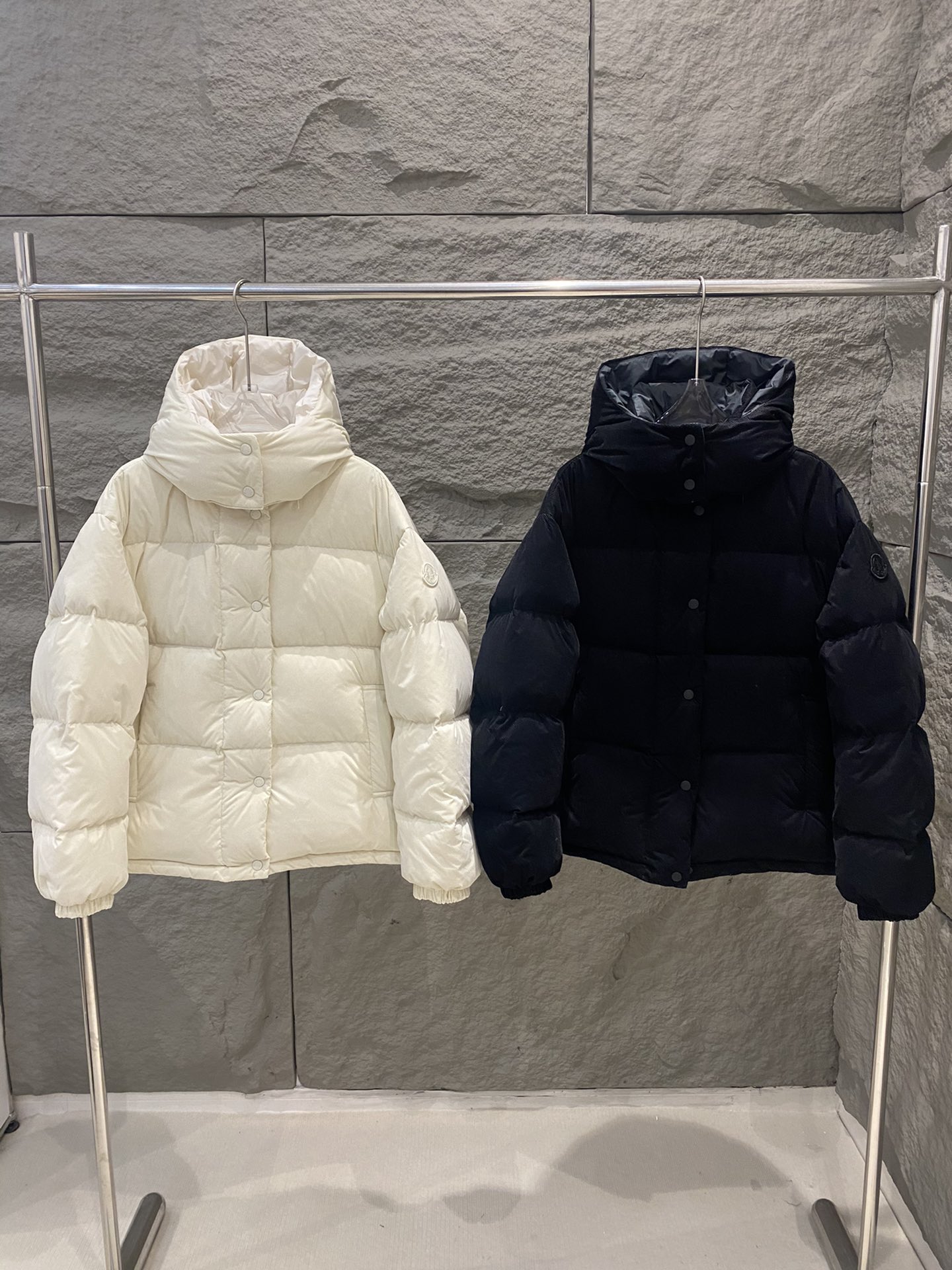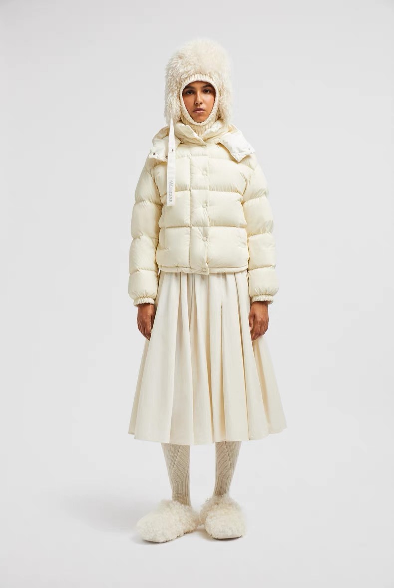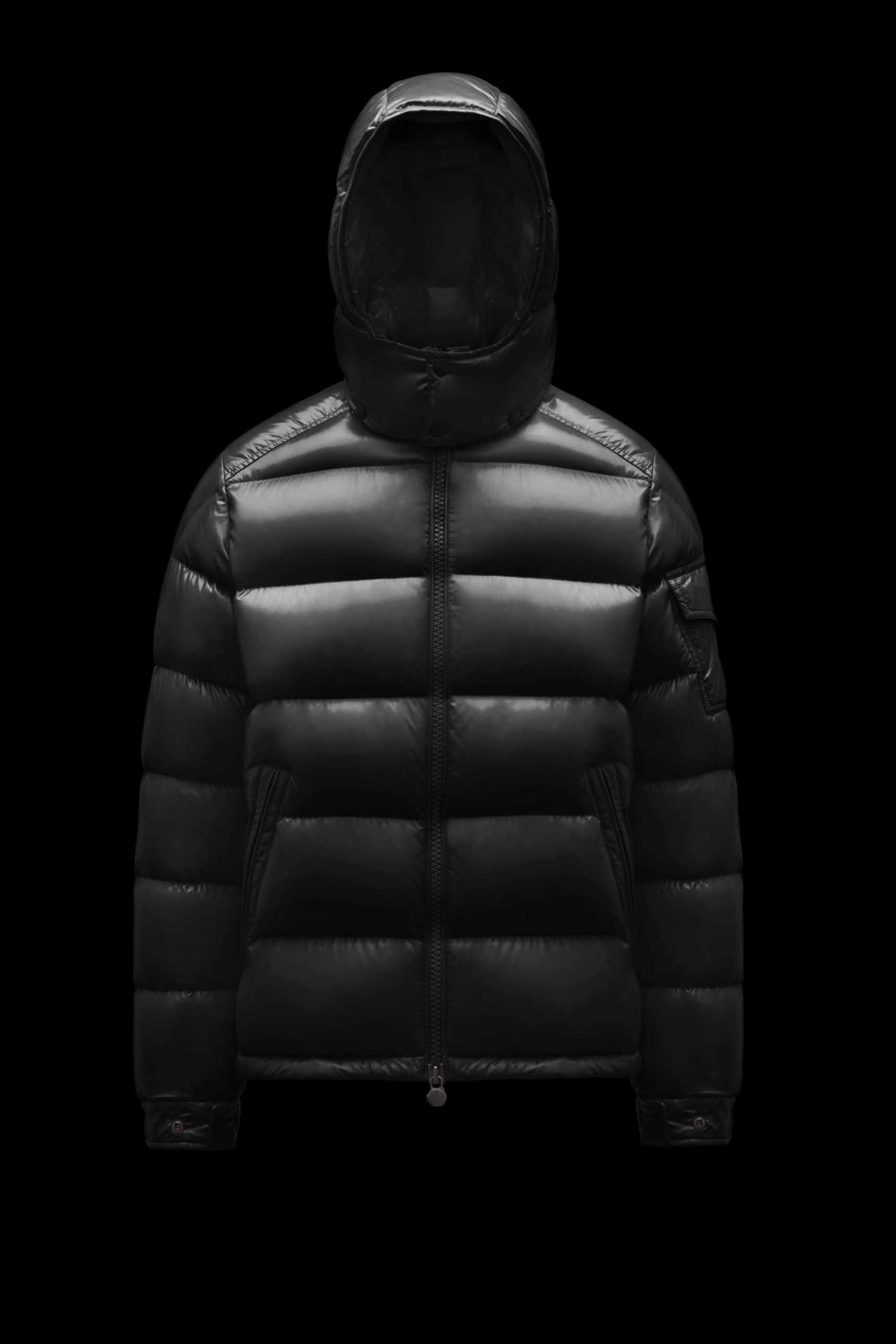 High-end Moncler Maya jacket, inspired by 80s design. Modern style with advanced features. Materials: 90% white goose down, 100% nylon. Colors: black, gray, green, blue, pink, white. Sizes 1-6.