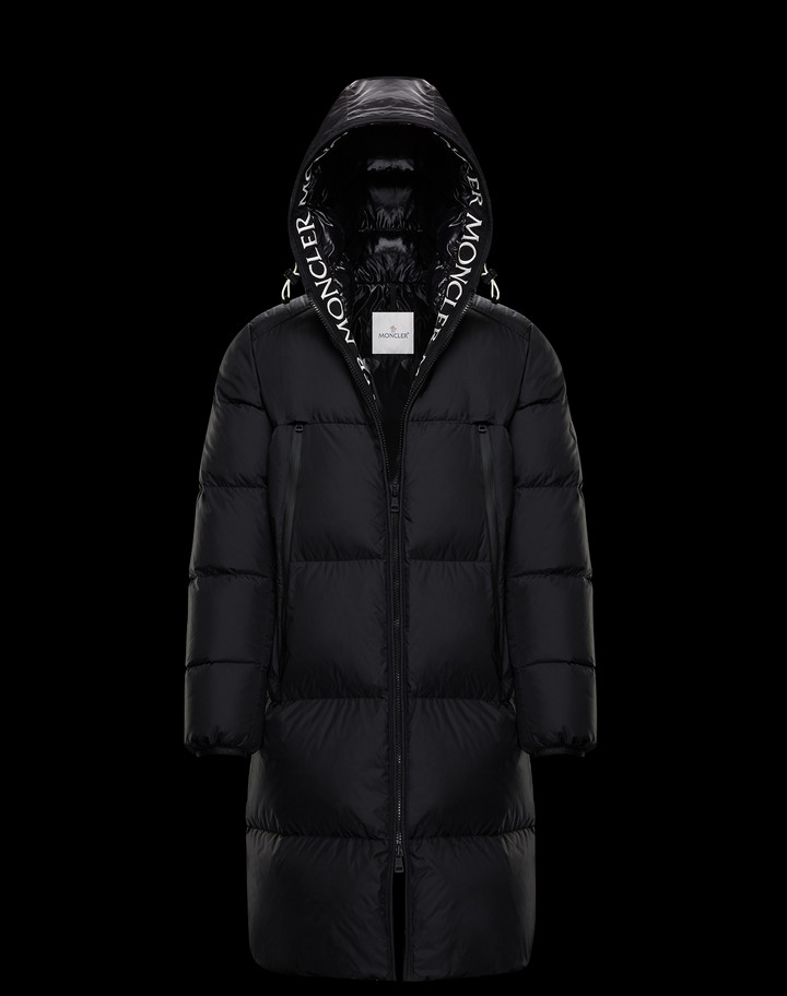 High-version Moncler long jacket with embroidered ribbon, nods to 80s style. Waterproof, insulated, quilted nylon with hood and adjustable hem. Colors: black, white.