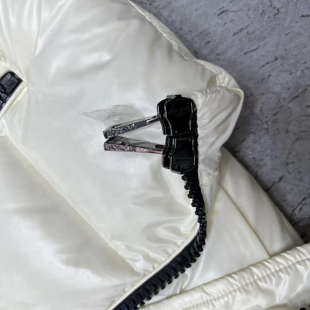 Top Moncler Ettore women's short velvet striped down jacket. Short design, lightweight nylon, removable hood, loose fit. Colors: cream/black. Sizes: 0/1/2/3.