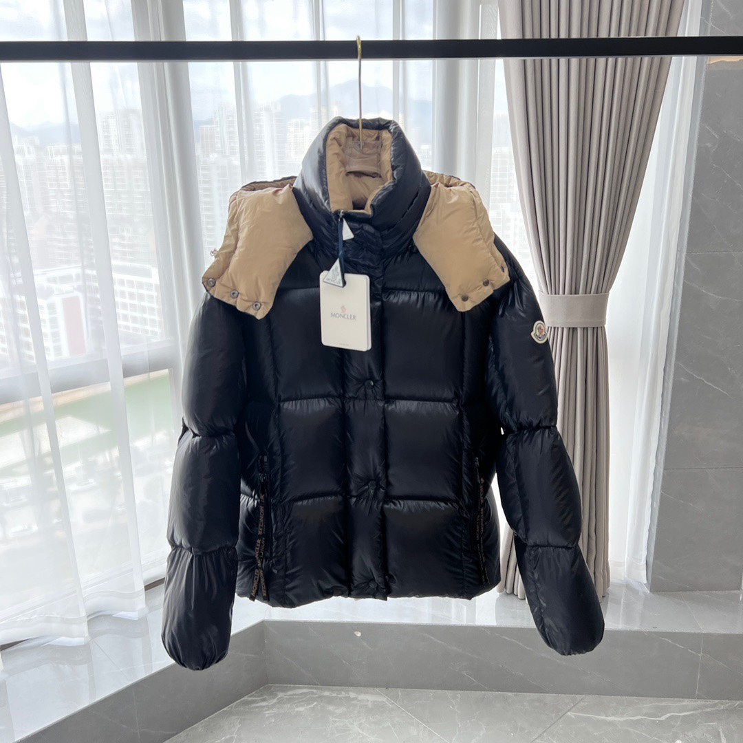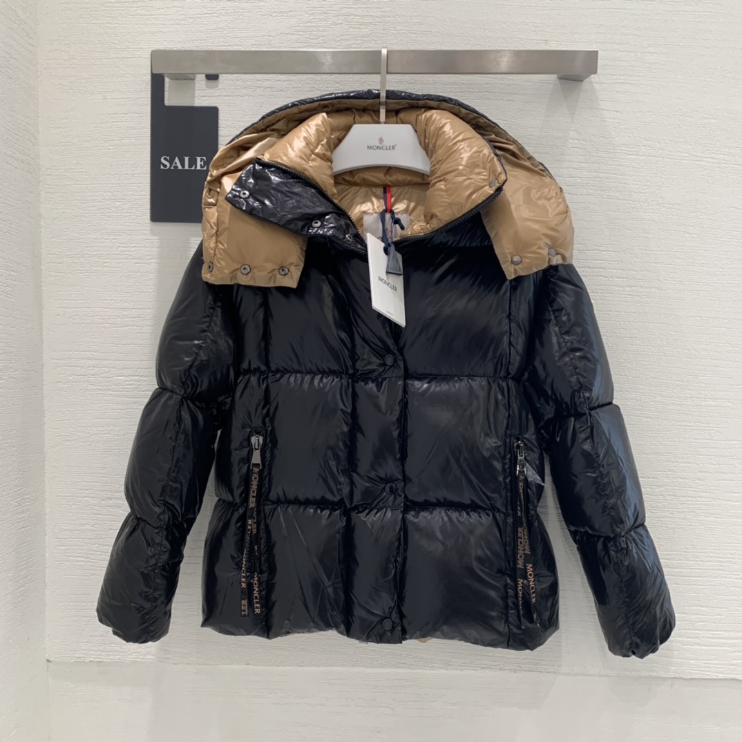 Guangzhou high-end Moncler black and gold hooded down jacket, short puffer style. Sizes: 0,1,2,3.