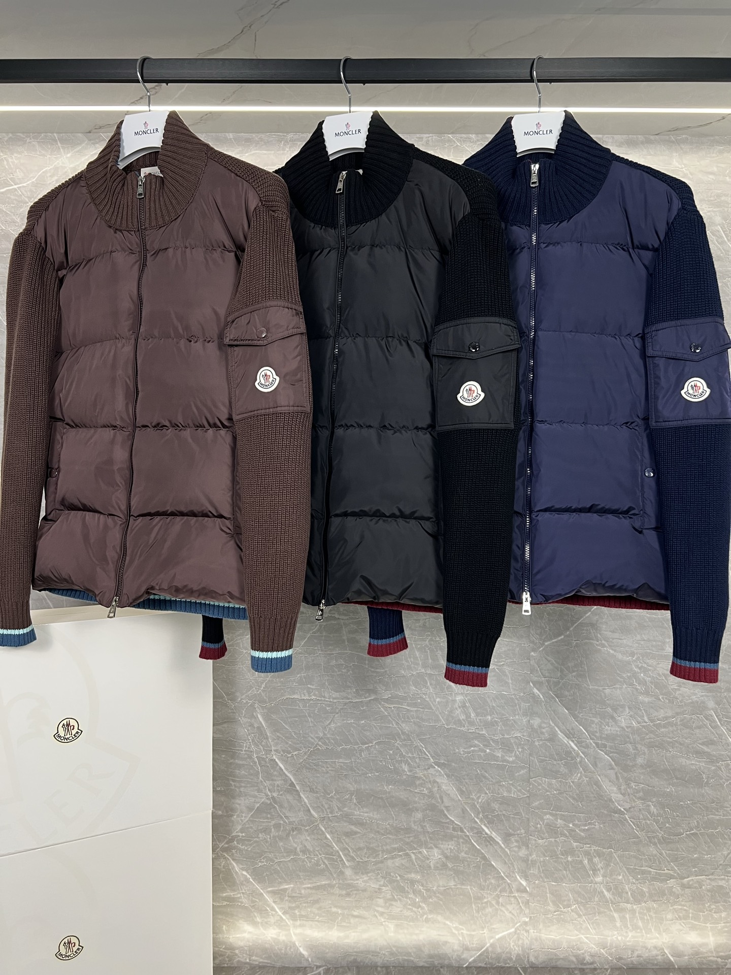 New Moncler zippered knitted jacket with stand-up collar, available in three colors and sizes M-3XL.