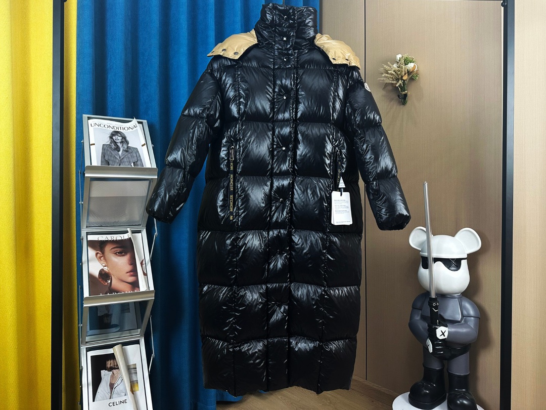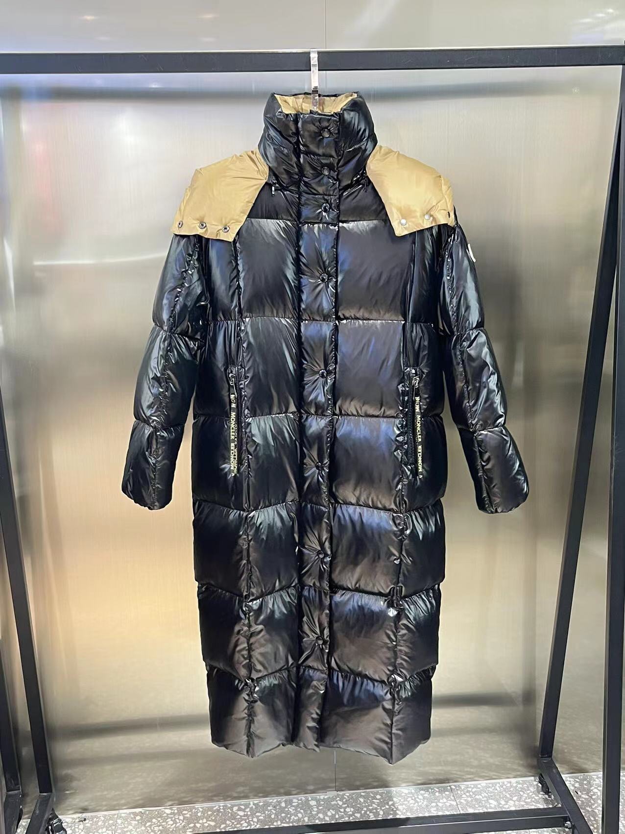 Guangzhou high-end Moncler long puffer jacket with color-blocking design. Unisex, filled with 90% white goose down, warm and stylish. Available in black, green, and gray-blue.