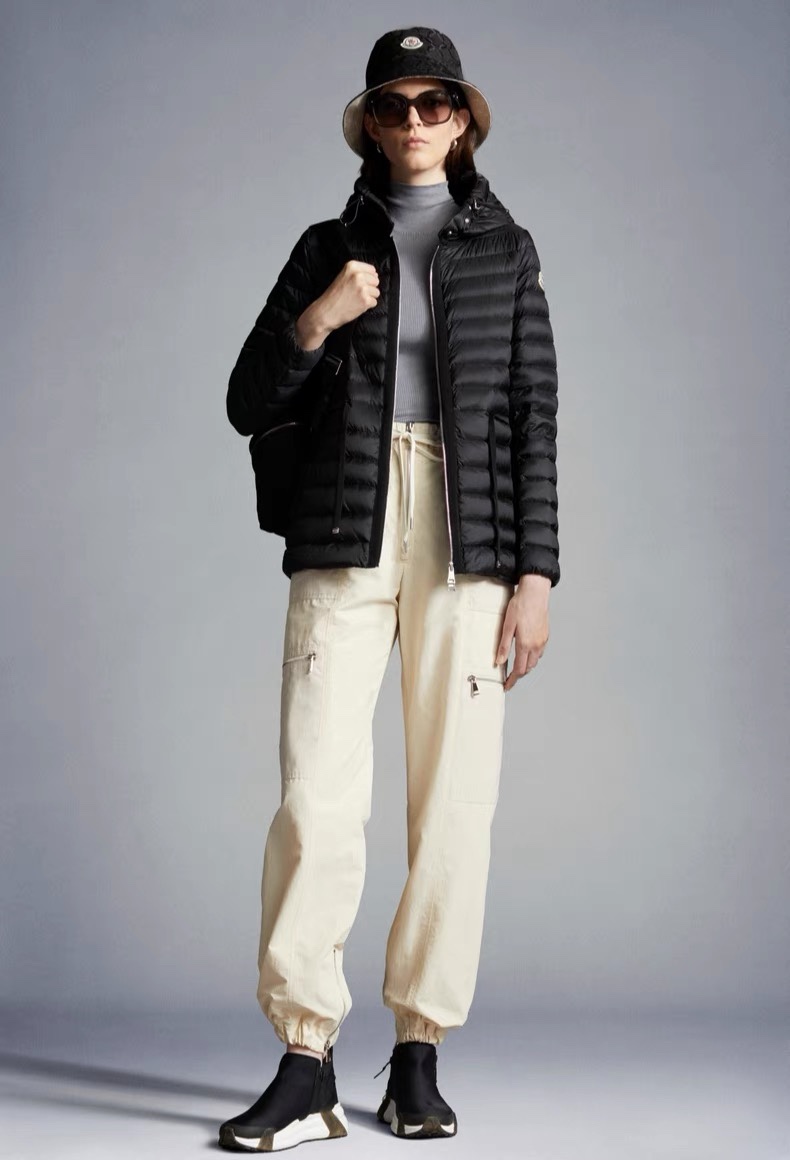High-quality Moncler Raie short down jacket in Guangzhou. Features clean design, waist drawstring, and satin details for a feminine silhouette. Lightweight nylon quilting. Colors: black/gray/purple. Sizes available.
