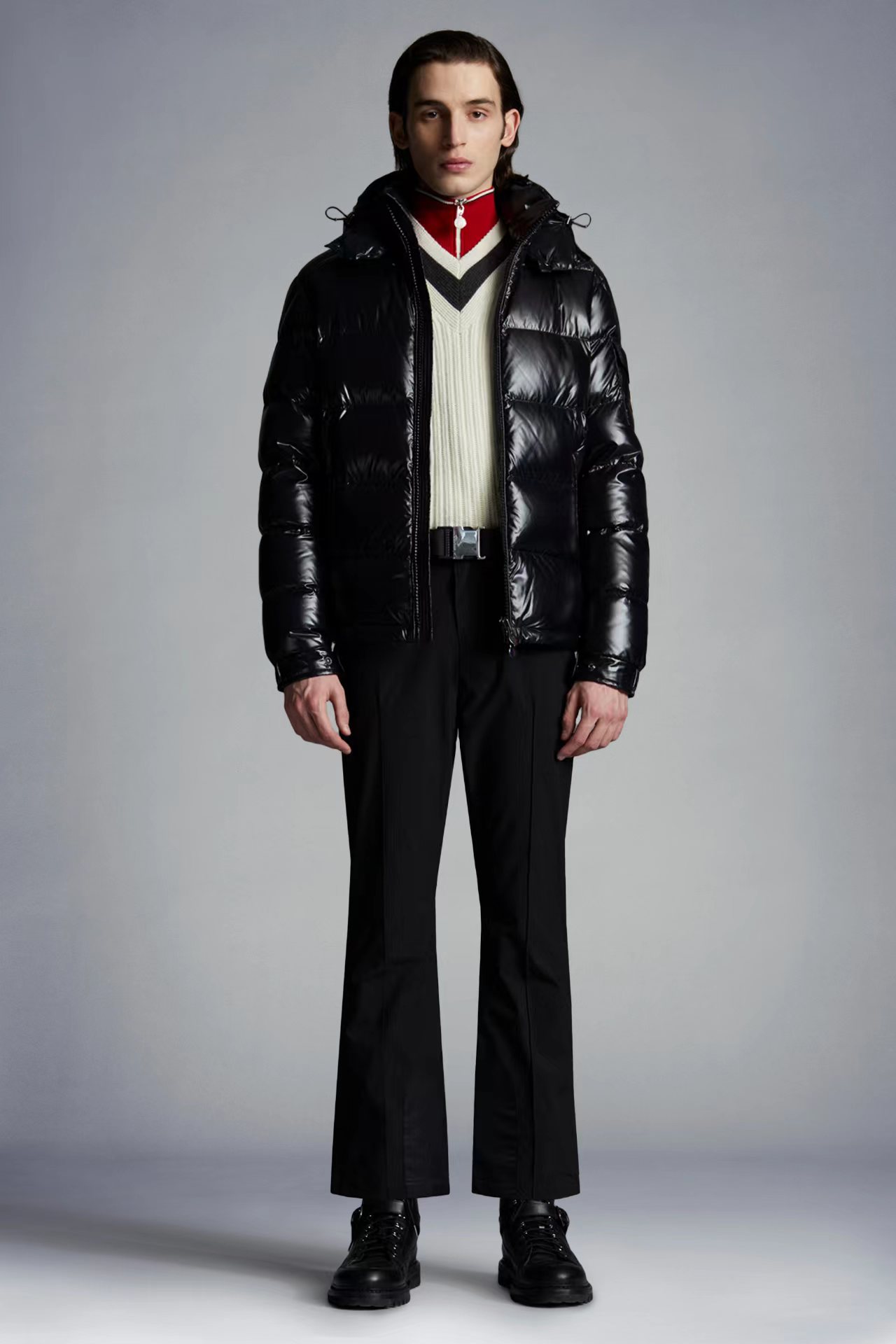 High-end Moncler Maya short down jacket in Guangzhou. Classic design with 80s-inspired details, glossy nylon, signature quilting, detachable hood, adjustable hem, and iconic branding.