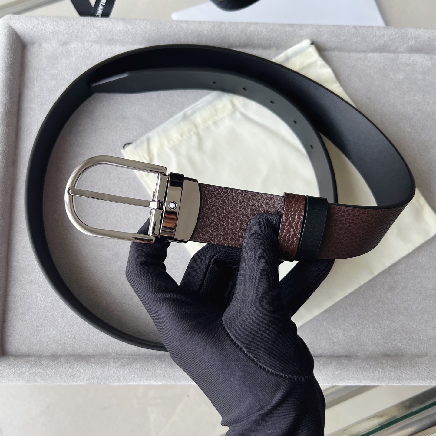 Montblanc 3.0cm wide imported leather belt with pin buckle, adjustable for business casual wear.