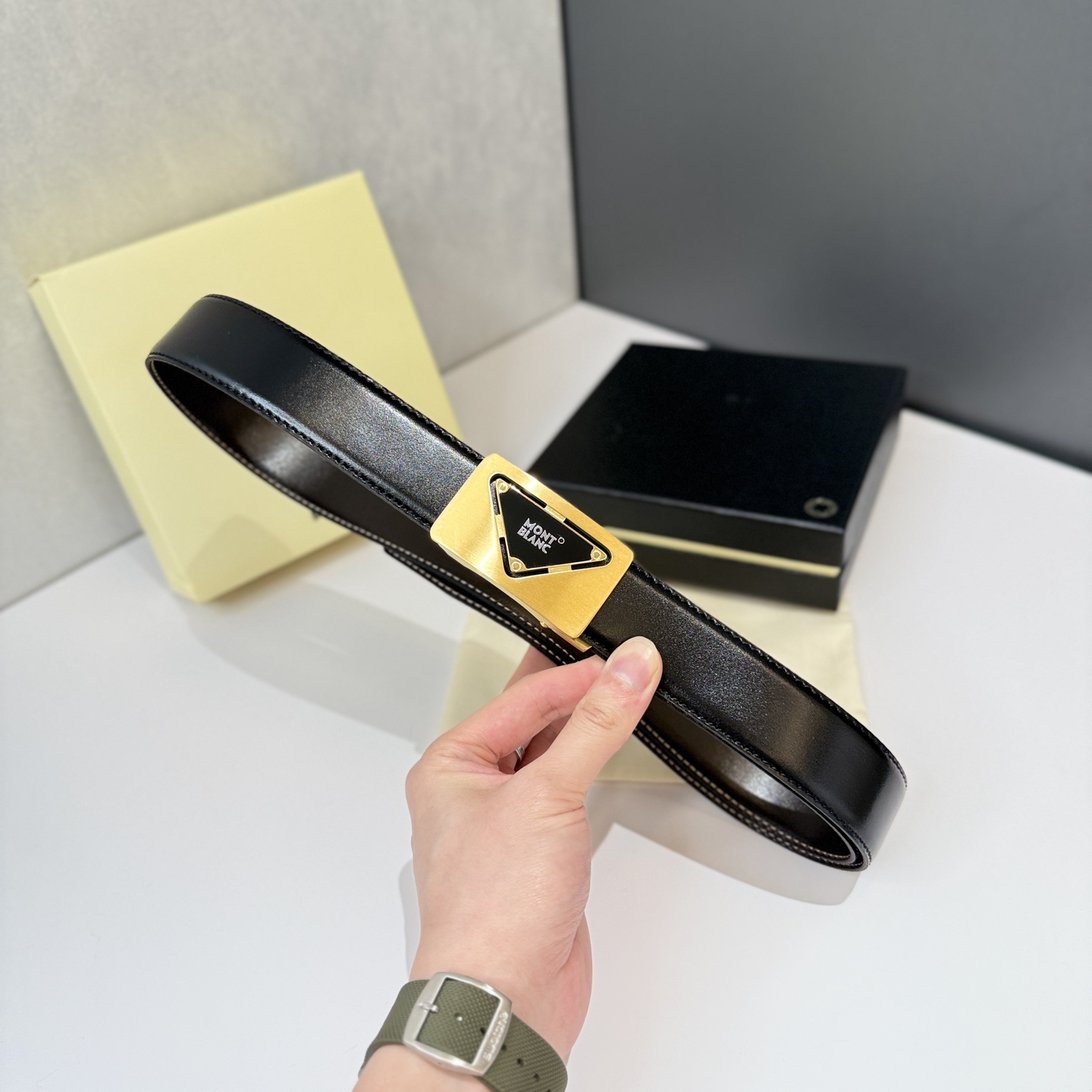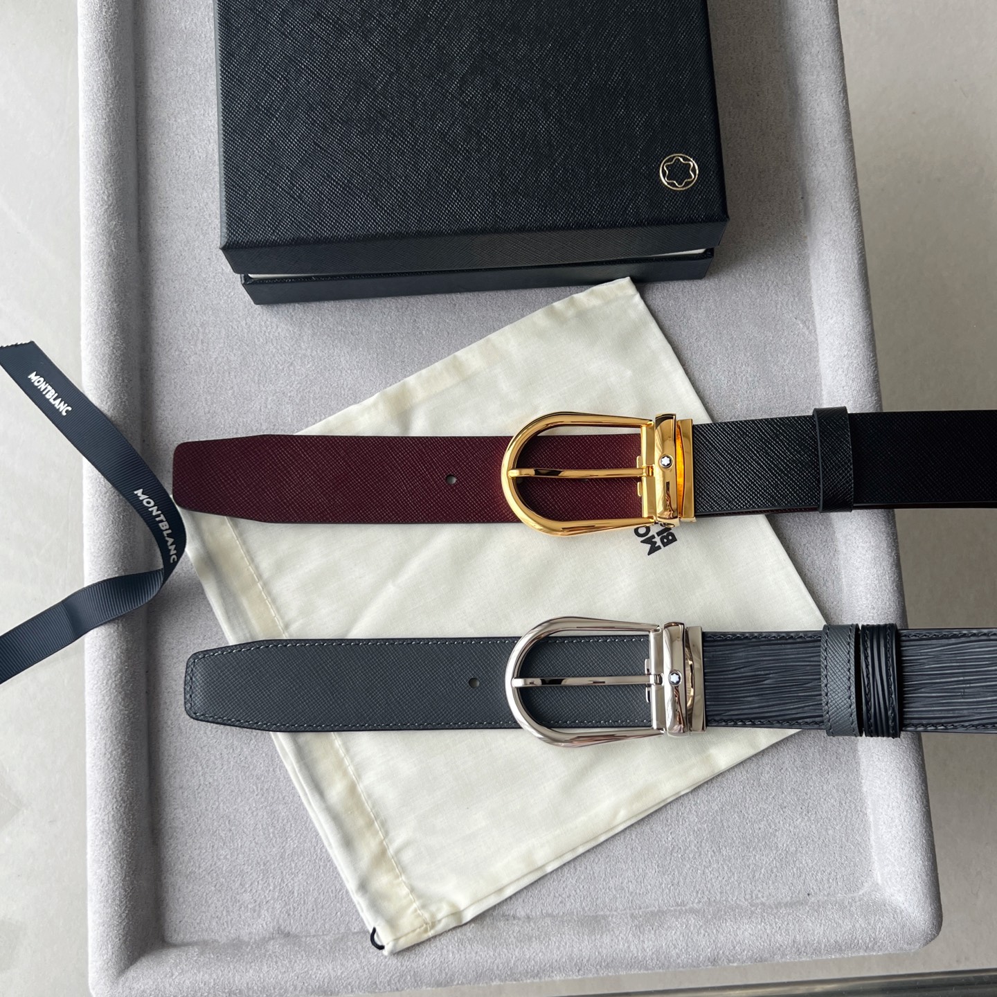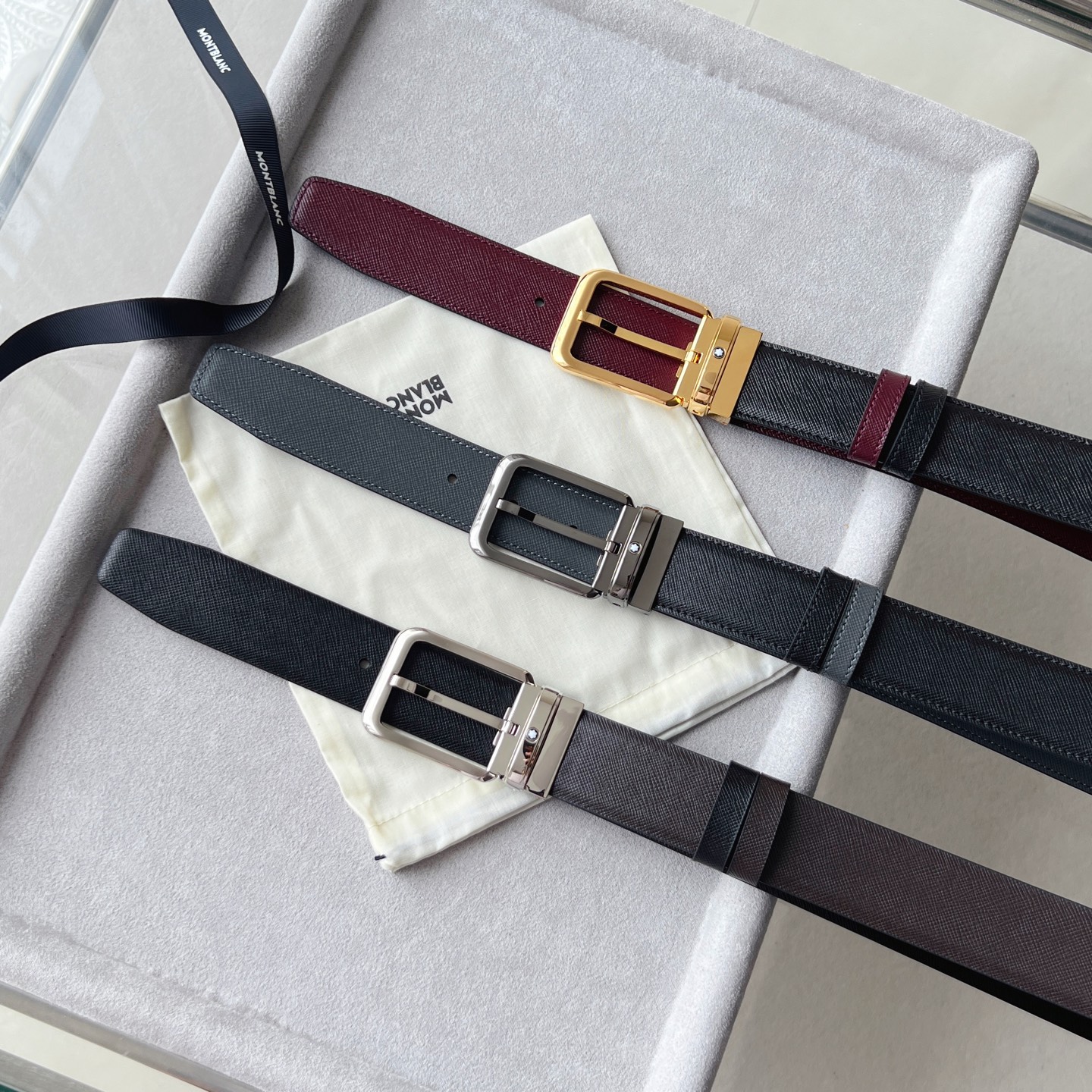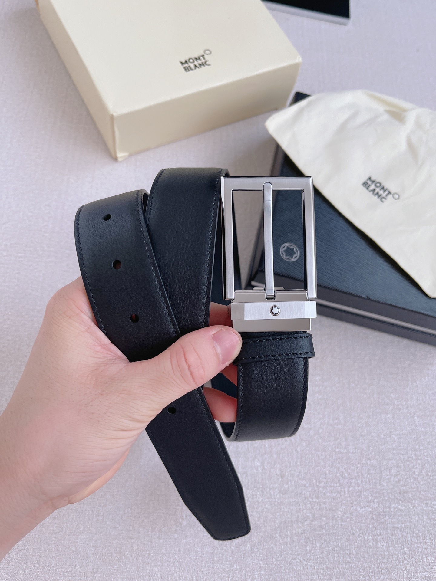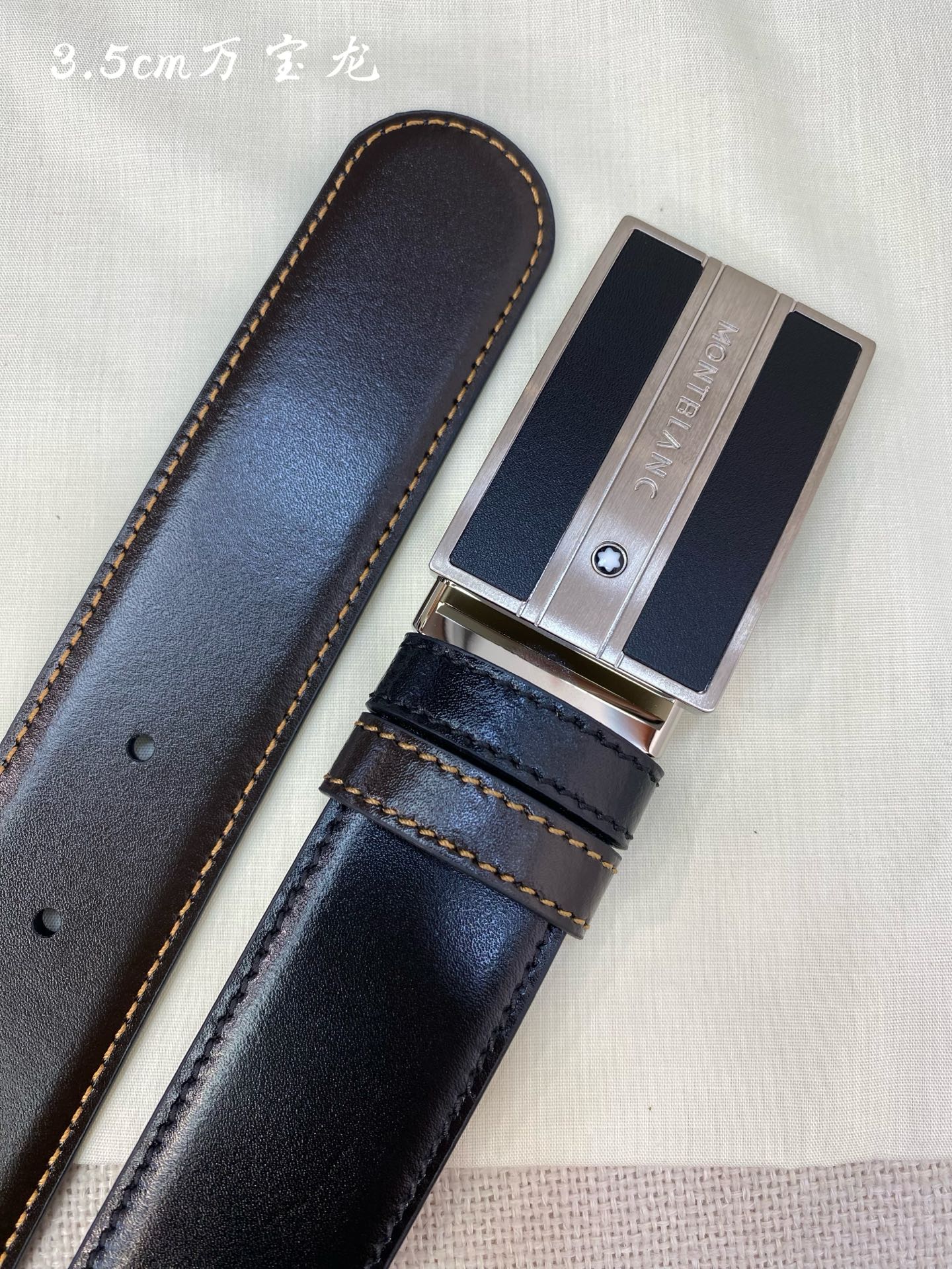 Montblanc 3.5cm wide genuine leather belt with pin buckle, adjustable for business casual wear.