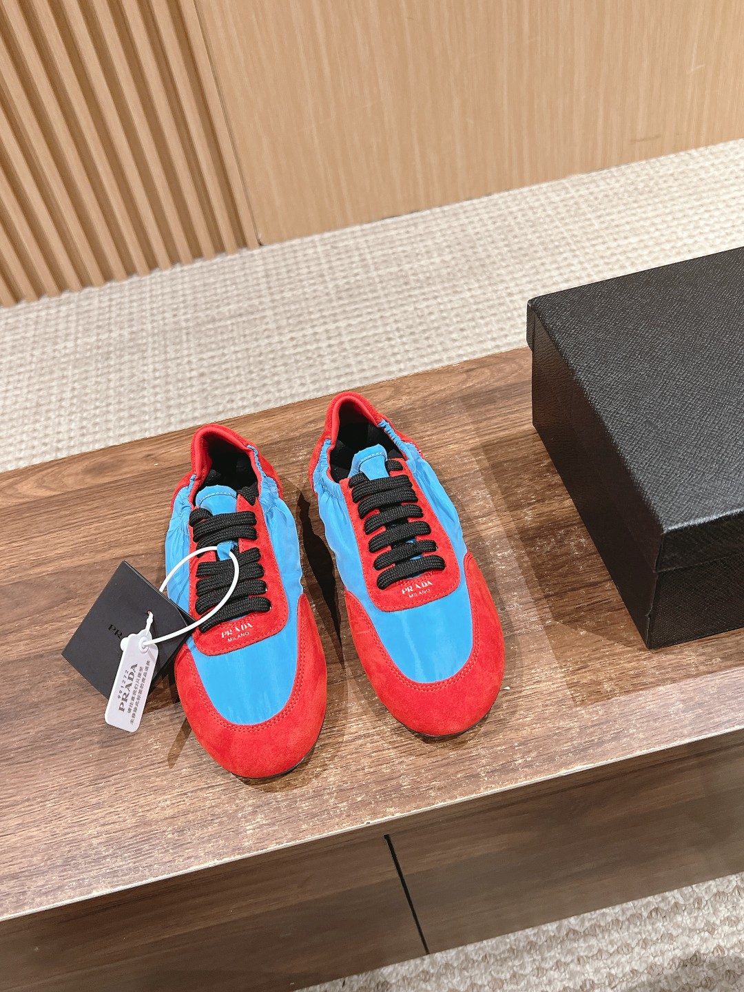 Prada women's training shoes in white. Lightweight, comfortable deerskin lining, suede upper, and TPU sole. Enhances leg length, versatile for all seasons. Sizes 35-41.