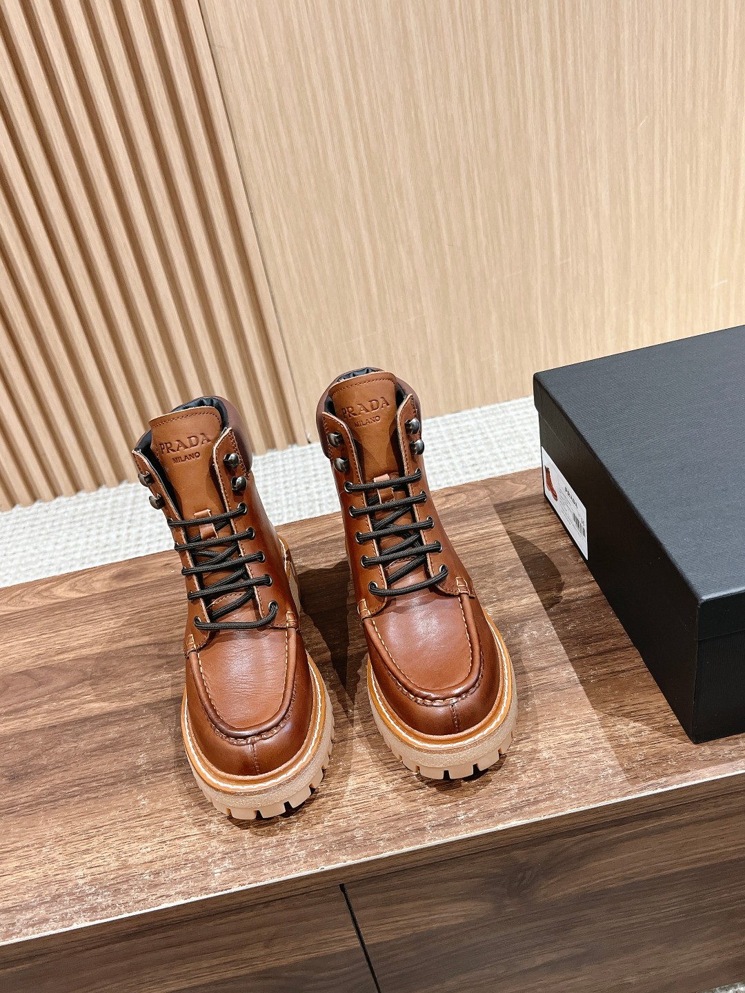 Prada platform leather Martin boots, retro style, imported calfskin upper, sheepskin lining, 4cm sole. Sizes 35-40.