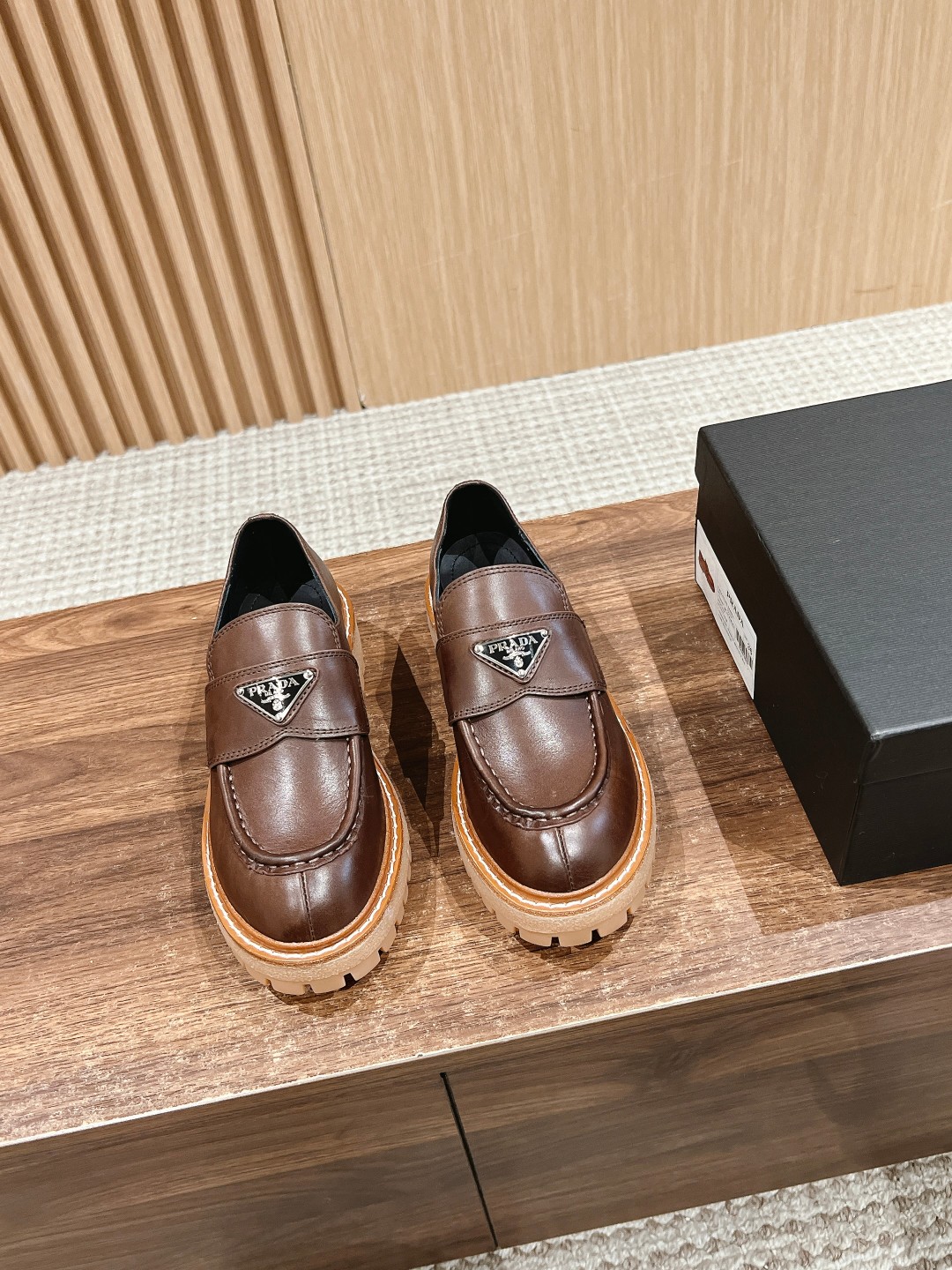Prada platform leather loafers, imported calfskin, soft lambskin lining, 4cm rubber sole. Sizes 35-40.