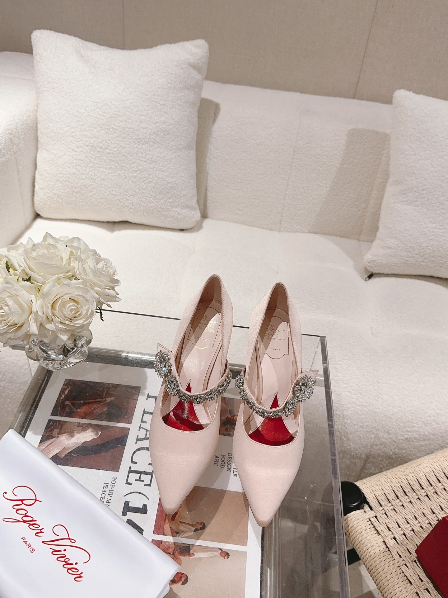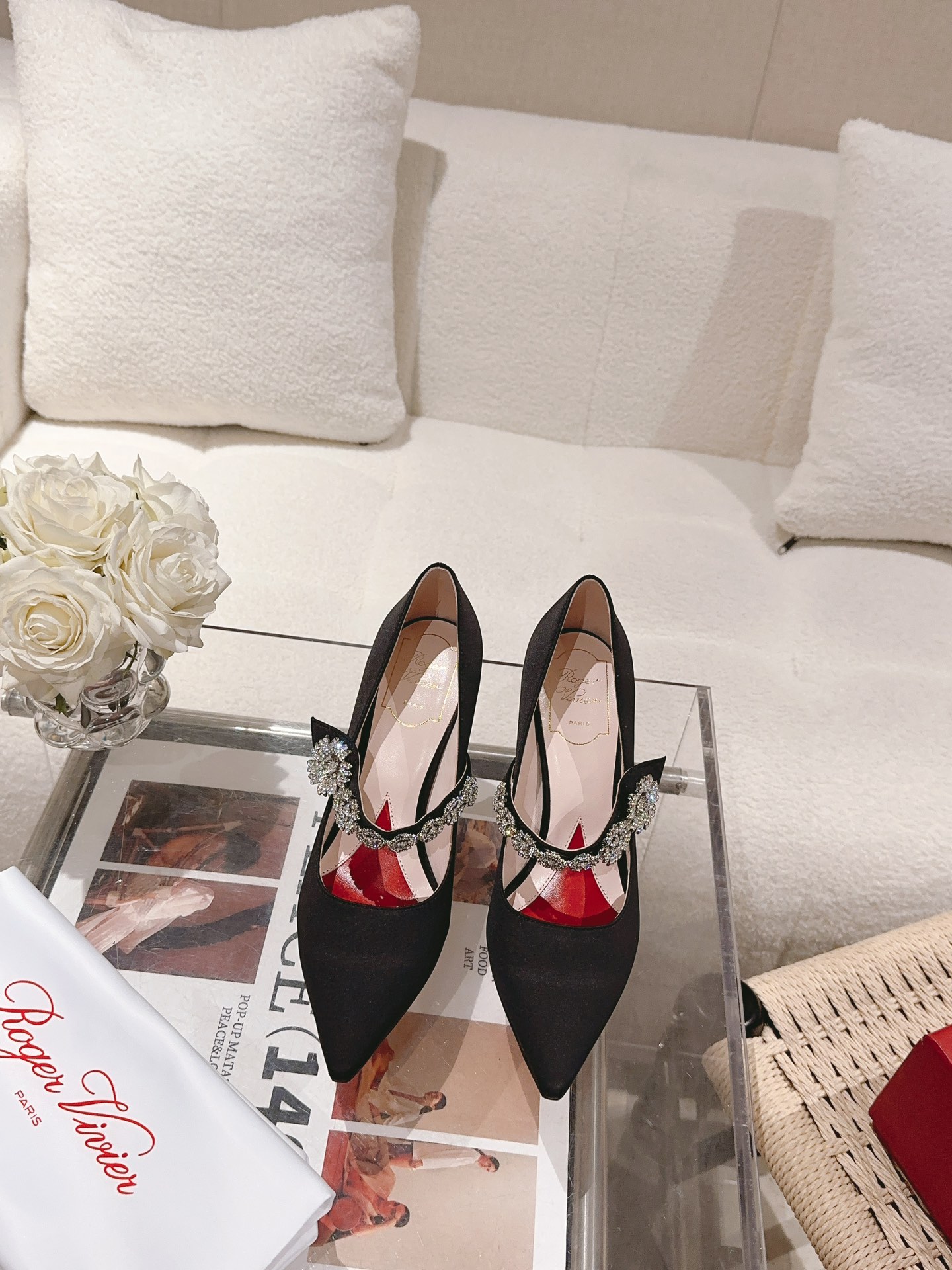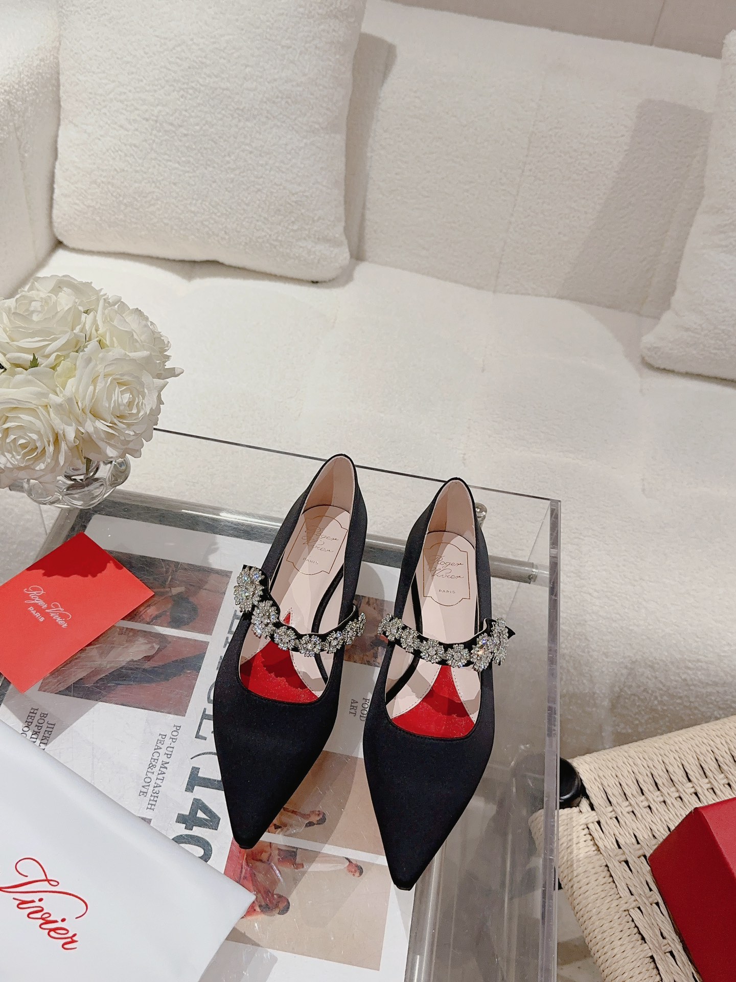 Roger Vivier 2023 SS silk pointed toe shoes with crystal buckle. Available in flat, 3.5cm low heel, 8.5cm high heel. Sizes 35-39, custom 34 & 40. Luxury packaging.