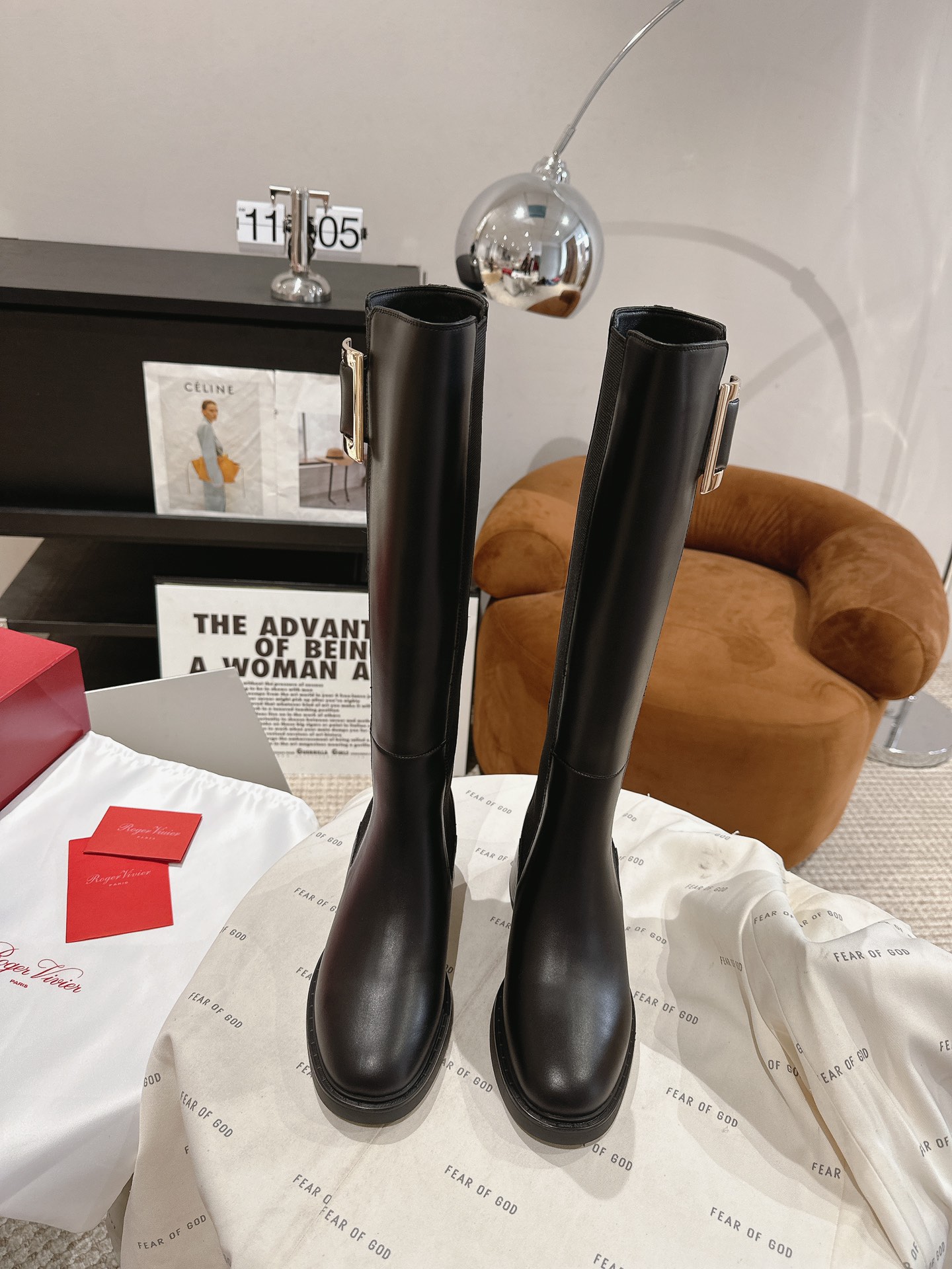 RogerVivier 2023 SS new square buckle thick heel knight boots. Genuine materials: custom waxed calfskin, special blended lambskin lining, non-slip sole. Sizes 35-39.