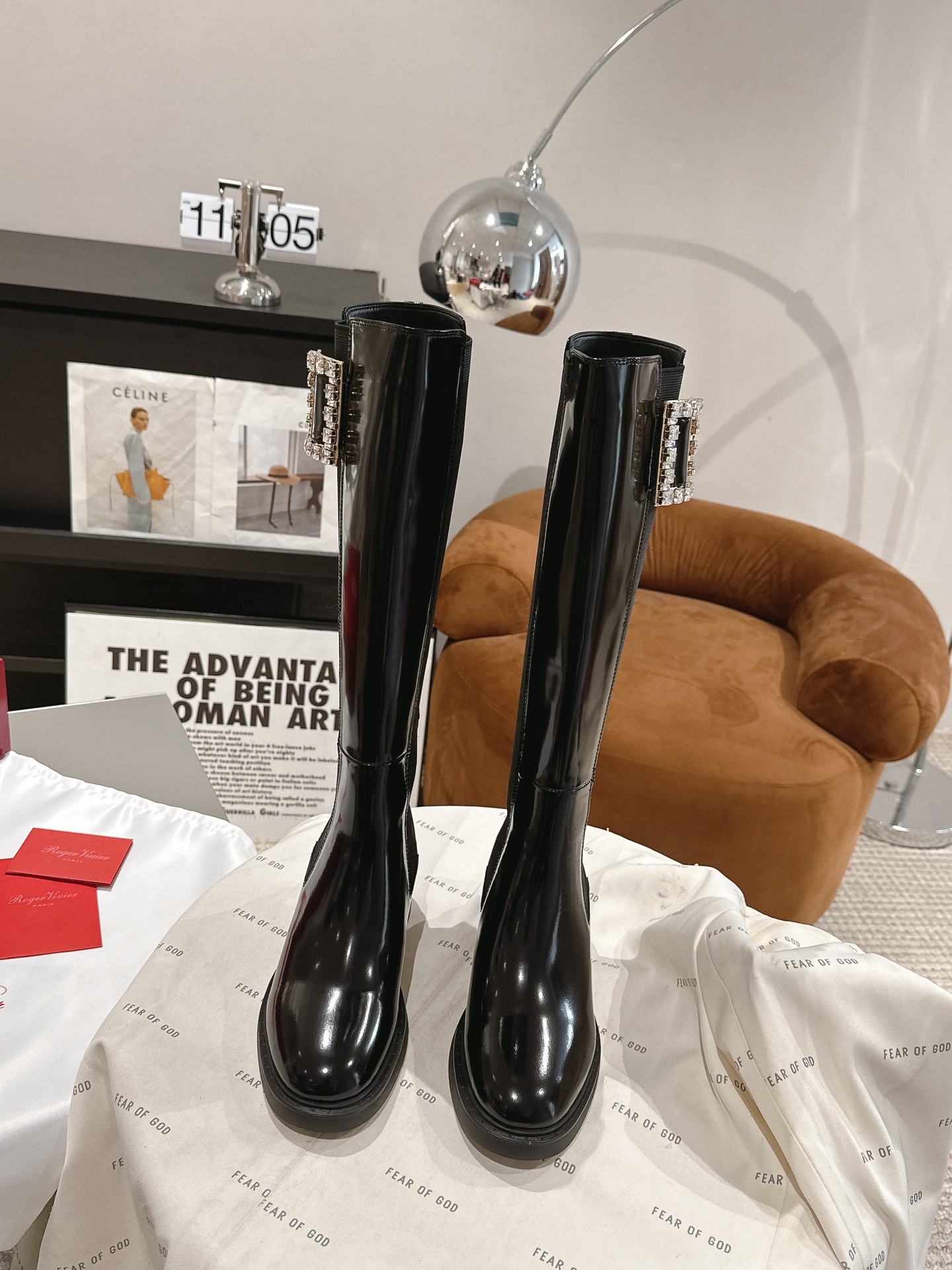 RogerVivier 2023 SS new square buckle thick heel knight boots. Genuine top quality from Taiwanese factory. Waxed calfskin upper, special blend sheepskin lining, non-slip sole. Sizes 35-39.